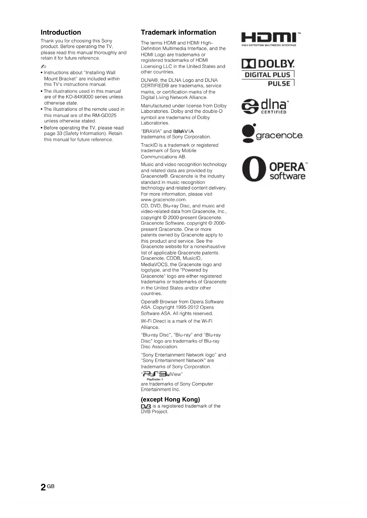- Before operating the TV, please read page 33 (Safety Information). Retain this manual for future reference. Trademark information The terms HDMI and HDMI High- Definition Multimedia Interface, and the HDMI Logo are trademarks or registered trademarks of HDMI Licensing LLC in the United States and other countries. DLNA®, the DLNA Logo and DLNA CERTIFIED® are trademarks, service marks, or certification marks of the Digital Living Network Alliance. Manufactured under license from Dolby Laboratories. Dolby and the double-D symbol are trademarks of Dolby Laboratories. “BRAVIA” and are trademarks of Sony Corporation. TrackID is a trademark or registered trademark of Sony Mobile Communications AB. Music and video recognition technology and related data are provided by Gracenote®. Gracenote is the industry standard in music recognition technology and related content delivery. For more information, please visit www.gracenote.com. CD, DVD, Blu-ray Disc, and music and video-related data from Gracenote, Inc., copyright © 2000-present Gracenote. Gracenote Software, copyright © 2000- present Gracenote. One or more patents owned by Gracenote apply to this product and service. See the Gracenote website for a nonexhaustive list of applicable Gracenote patents. Gracenote, CDDB, MusicID, MediaVOCS, the Gracenote logo and logotype, and the “Powered by Gracenote” logo are either registered trademarks or trademarks of Gracenote in the United States and/or other countries. Opera® Browser from Opera Software ASA. Copyright 1995-2012 Opera Software ASA. All rights reserved. Wi-Fi Direct is a mark of the Wi-Fi Alliance. “Blu-ray Disc”, “Blu-ray” and “Blu-ray Disc” logo are trademarks of Blu-ray Disc Association. “Sony Entertainment Network logo” and “Sony Entertainment Network” are trademarks of Sony Corporation. “ ” and “SimulView” are trademarks of Sony Computer Entertainment Inc. (except Hong Kong) is a registered trademark of the DVB Project.3