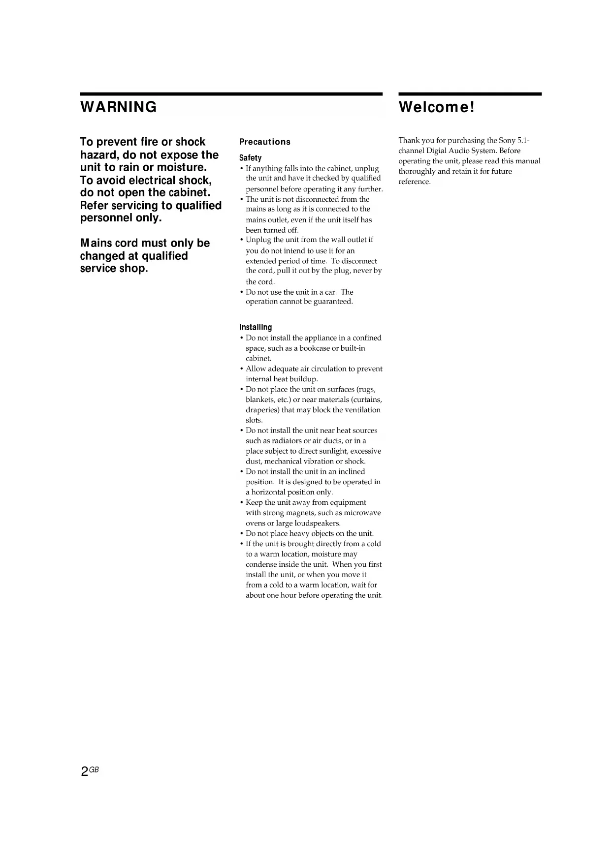 Welcome! Thank you for purchasing the Sony 5.1-channel Digial Audio System. Beforeoperating the unit, please read this manualthoroughly and retain it for futurereference. WARNING To prevent fire or shock hazard, do not expose the unit to rain or moisture. To avoid electrical shock, do not open the cabinet. Refer servicing to qualified personnel only. Mains cord must only be changed at qualified service shop. Precautions Safety