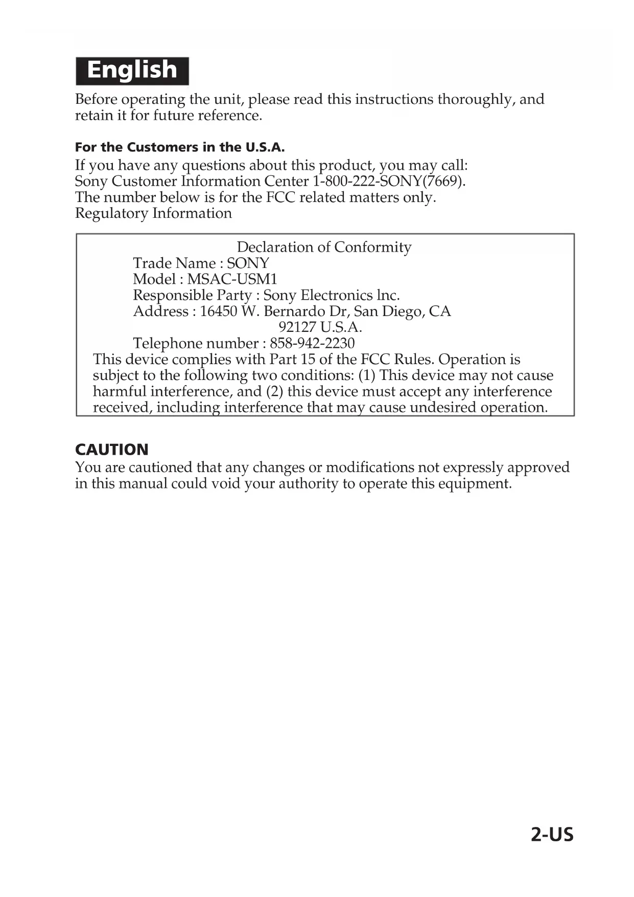2-067-390-11 (1) US MA-000078-01G Multi Slot USB Reader/Writer MSAC-USM1 Operating Instructions2-US English Before operating the unit, please read this instructions thoroughly, and retain it for future reference. For the Customers in the U.S.A. If you have any questions about this product, you may call: Sony Customer Information Center 1-800-222-SONY(7669). The number below is for the FCC related matters only. Regulatory Information CAUTION You are cautioned that any changes or modifications not expressly approved in this manual could void your authority to operate this equipment. Declaration of Conformity Trade Name : SONY Model : MSAC-USM1 Responsible Party : Sony Electronics lnc. Address : 16450 W. Bernardo Dr, San Diego, CA 92127 U.S.A. Telephone number : 858-942-2230 This device complies with Part 15 of the FCC Rules. Operation is subject to the following two conditions: (1) This device may not cause harmful interference, and (2) this device must accept any interference received, including interference that may cause undesired operation.3-US Note: This equipment has been tested and found to comply with the limits for a Class B digital device, pursuant to Part 15 of the FCC Rules. These limits are designed to provide reasonable protection against harmful interference in a residential installation. This equipment generates, uses, and can radiate radio frequency energy and, if not installed and used in accordance with the instructions, may cause harmful interference to radio communications. However, there is no guarantee that interference will not occur in a particular installation. If this equipment does cause harmful interference to radio or television reception, which can be determined by turning the equipment off and on, the user is encouraged to try to correct the interference by one or more of the following measures: – Reorient or relocate the receiving antenna. – Increase the separation between the equipment and receiver. – Connect the equipment into an outlet on a circuit different from that to which the receiver is connected. – Consult the dealer or an experienced radio/TV technician for help. The specified USB cable (supplied) must be used with the equipment in order to comply with the limits for a digital device pursuant to Subpart B of Part 15 of FCC Rules. For the customers in Canada This class B digital apparatus complies with Canadian ICES-003. Notice If static electricity or electromagnetism causes data transfer to discontinue midway (fail), restart the application or disconnect and connect the USB cable again.4-US Program©2000-2004 Sony Corporation Documentation©2004 Sony Corporation