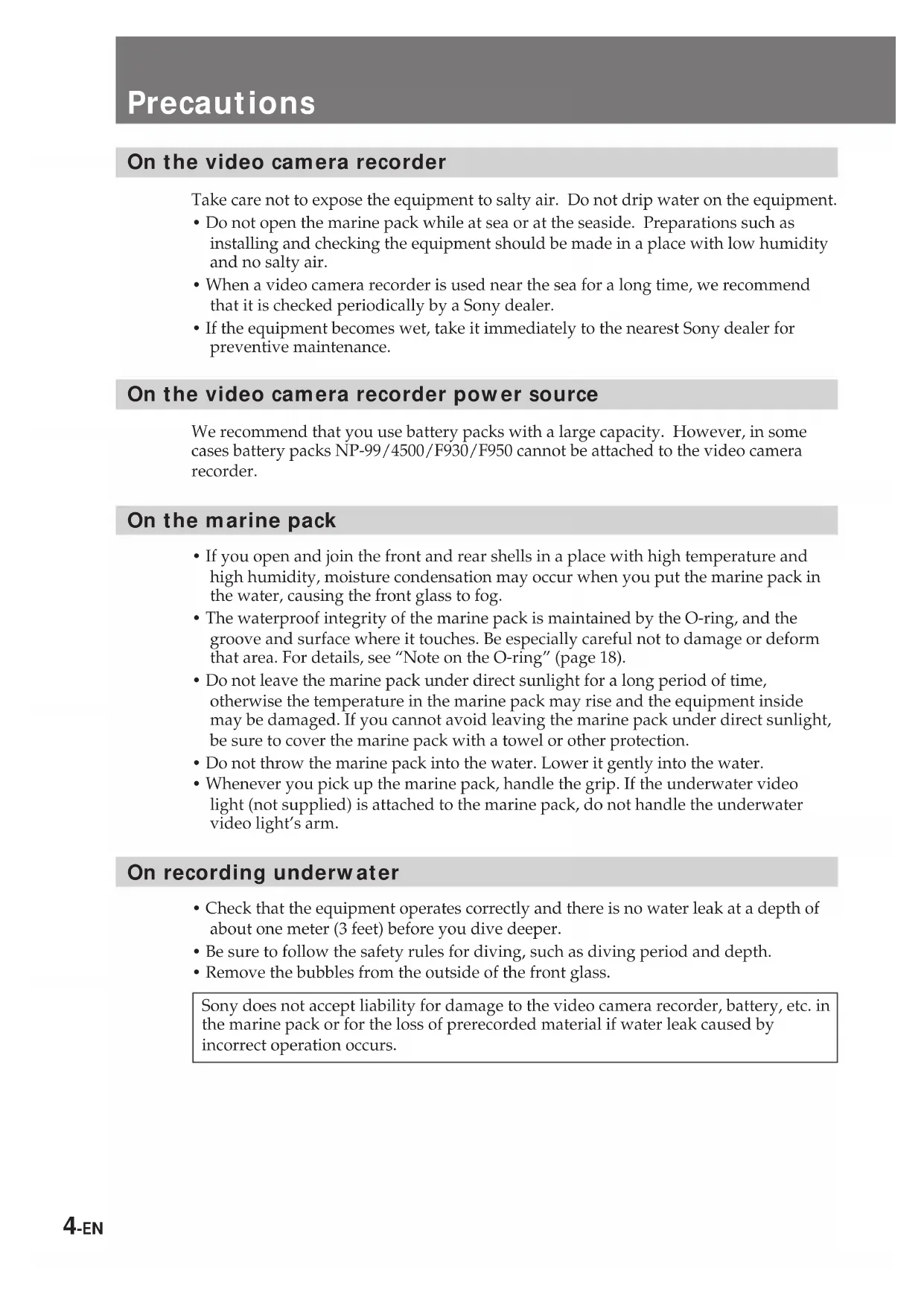 - Remove the bubbles from the outside of the front glass. Sony does not accept liability for damage to the video camera recorder, battery, etc. in the marine pack or for the loss of prerecorded material if water leak caused by incorrect operation occurs.P 5-EN