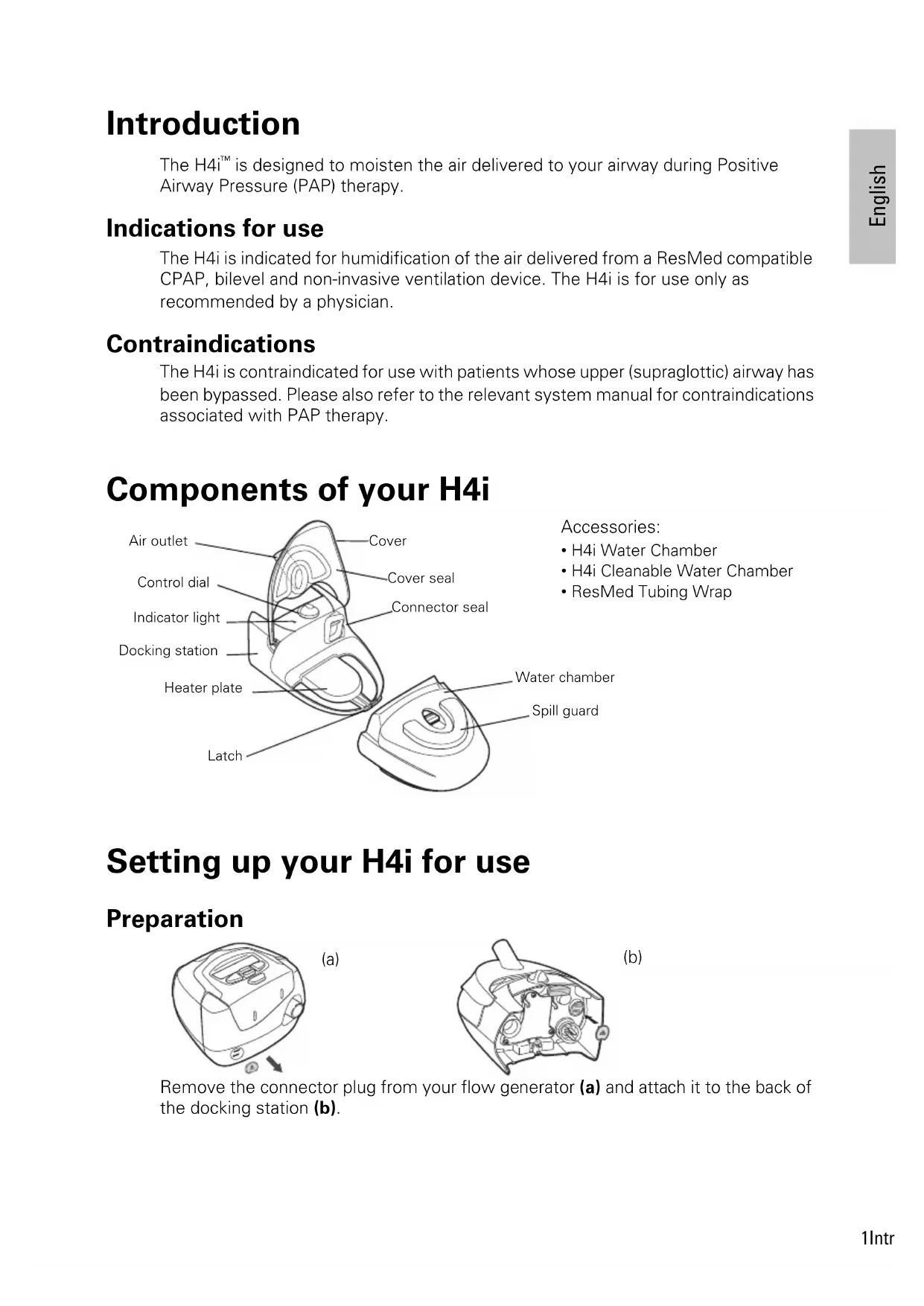 is designed to moisten the air delivered to your airway during Positive Airway Pressure (PAP) therapy. Indications for use The H4i is indicated for humidification of the air delivered from a ResMed compatible CPAP, bilevel and non-invasive ventilation device. The H4i is for use only as recommended by a physician. Contraindications The H4i is contraindicated for use with patients whose upper (supraglottic) airway has been bypassed. Please also refer to the relevant system manual for contraindications associated with PAP therapy. Components of your H4i Setting up your H4i for use Preparation Remove the connector plug from your flow generator (a) and attach it to the back of the docking station (b). Cover sealCoverConnector sealAir outletLatchHeater plateWater chamberDocking stationControl dial Accessories: