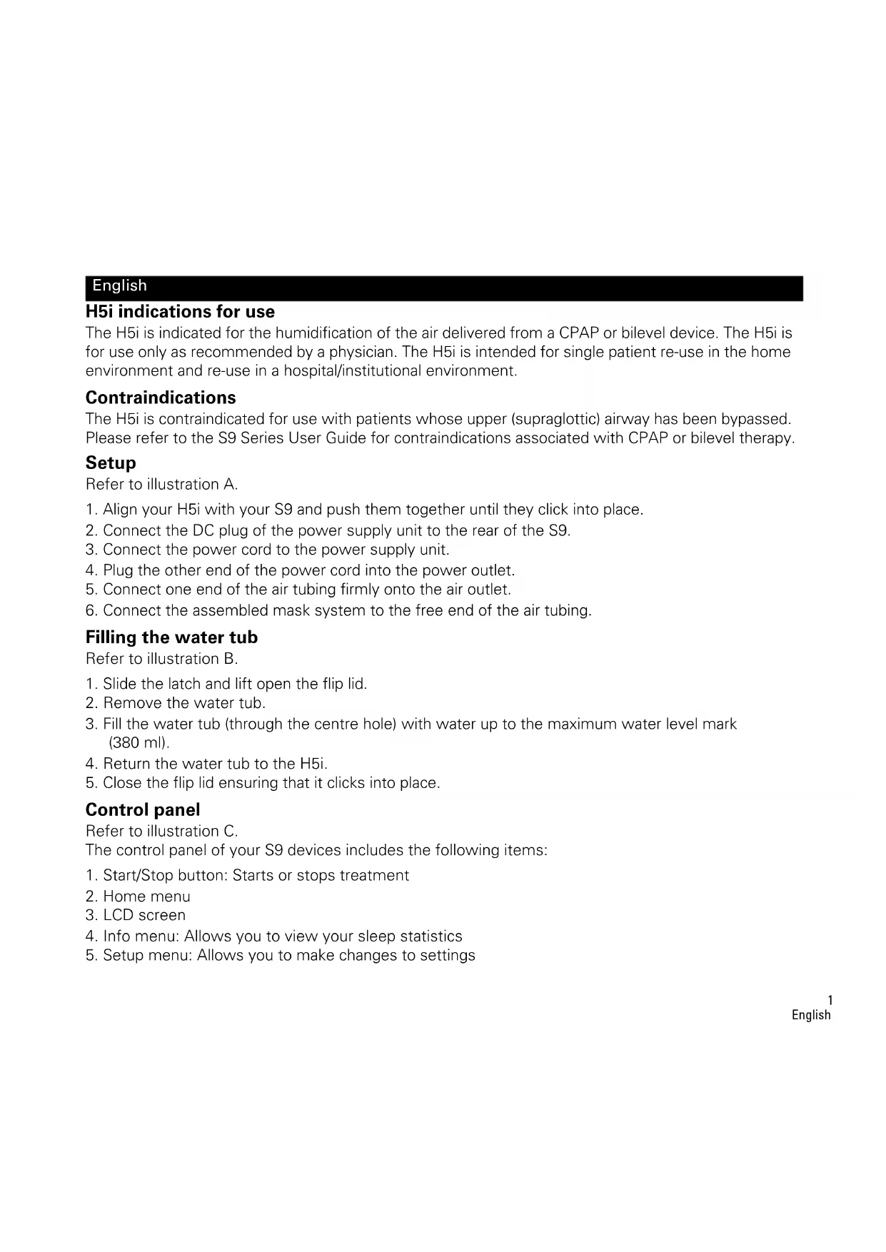H5i indications for use The H5i is indicated for the humidification of the air delivered from a CPAP or bilevel device. The H5i is for use only as recommended by a physician. The H5i is intended for single patient re-use in the home environment and re-use in a hospital/institutional environment. Contraindications The H5i is contraindicated for use with patients whose upper (supraglottic) airway has been bypassed. Please refer to the S9 Series User Guide for contraindications associated with CPAP or bilevel therapy. Setup Refer to illustration A.