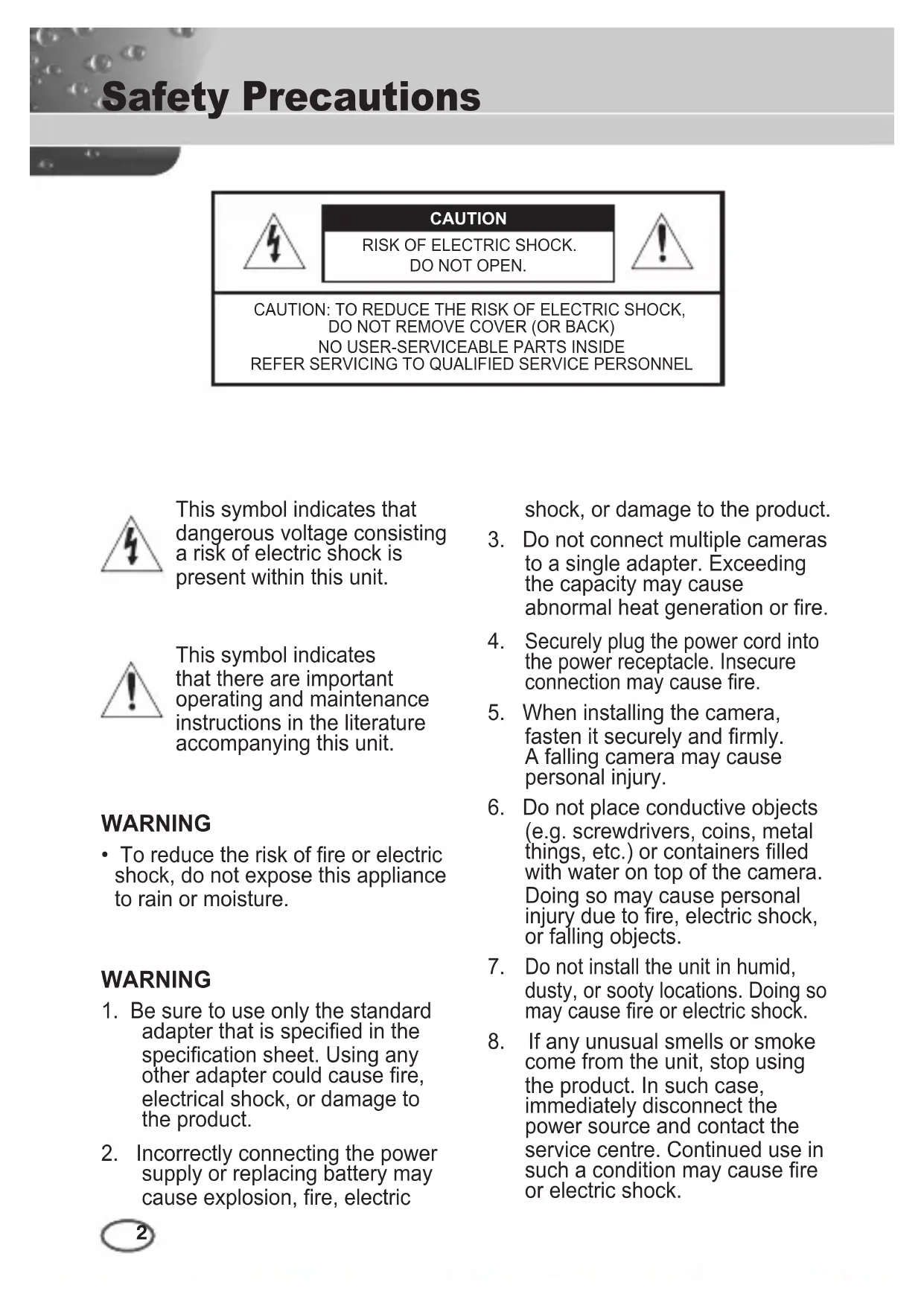 come from the unit, stop using the product. In such case, immediately disconnect the power source and contact the service centre. Continued use in such a condition may cause re or electric shock. SafetyPrecautions CAUTION: TO REDUCE THE RISK OF ELECTRIC SHOCK, DO NOT REMOVE COVER (OR BACK)