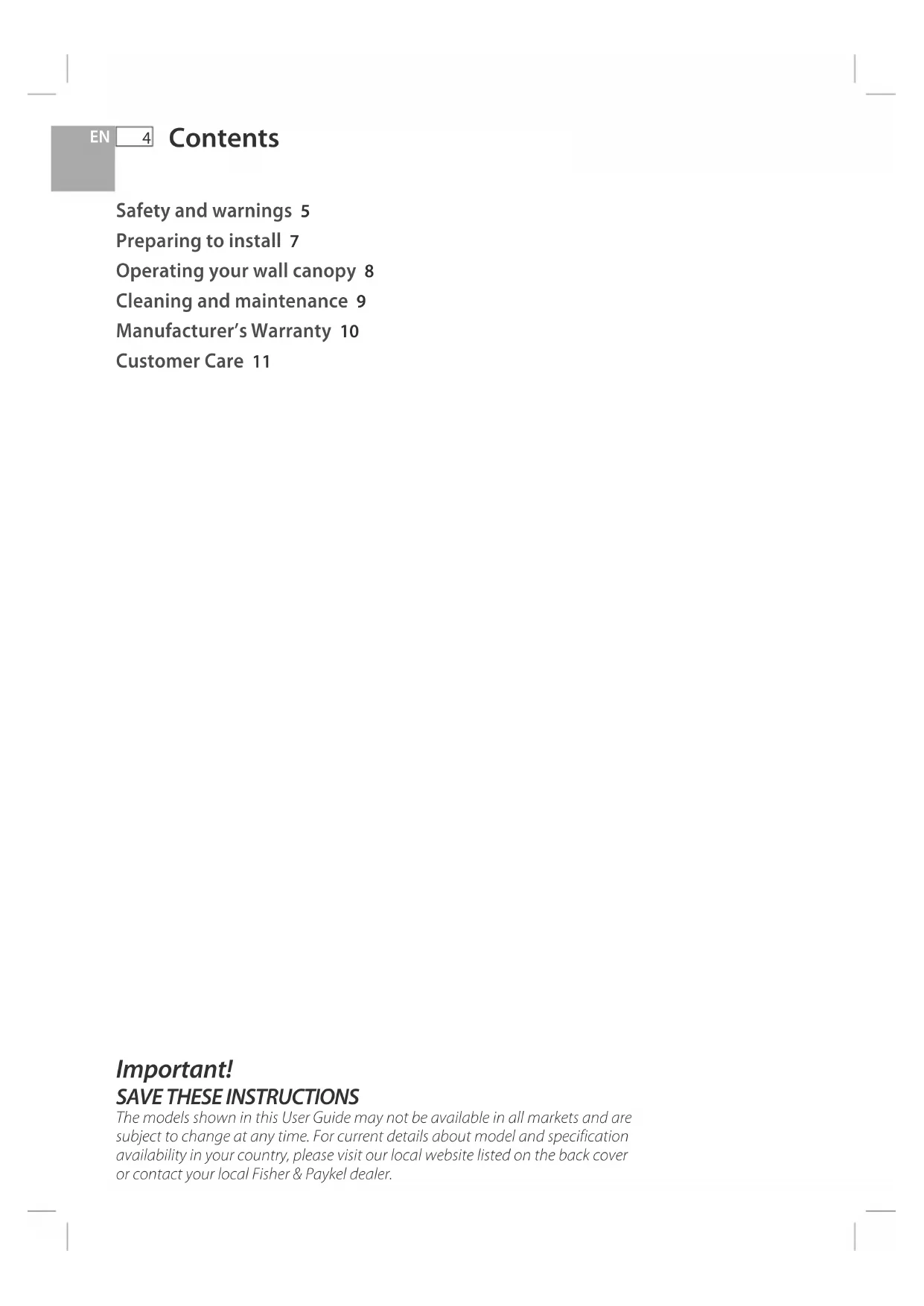 The models shown in this User Guide may not be available in all markets and are subject to change at any time. For current details about model and specification availability in your country, please visit our local website listed on the back cover or contact your local Fisher & Paykel dealer. Safety and warnings 5 Preparing to install 7 Operating your wall canopy 8 Cleaning and maintenance 9 Manufacturer’s Warranty 10 Customer Care 115