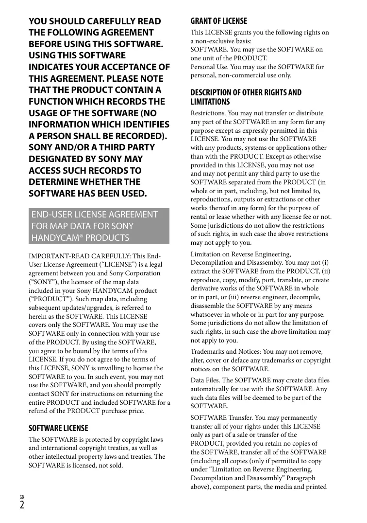 USING THIS SOFTWARE INDICATES YOUR ACCEPTANCE OF THIS AGREEMENT. PLEASE NOTE THAT THE PRODUCT CONTAIN A FUNCTION WHICH RECORDS THE USAGE OF THE SOFTWARE (NO INFORMATION WHICH IDENTIFIES A PERSON SHALL BE RECORDED). SONY AND/OR A THIRD PARTY DESIGNATED BY SONY MAY ACCESS SUCH RECORDS TO DETERMINE WHETHER THE SOFTWARE HAS BEEN USED. END-USER LICENSE AGREEMENT FOR MAP DATA FOR SONY HANDYCAM® PRODUCTS IMPORTANT-READ CAREFULLY: This EndUser License Agreement (“LICENSE”) is a legal agreement between you and Sony Corporation (“SONY”), the licensor of the map data included in your Sony HANDYCAM product (“PRODUCT”). Such map data, including subsequent updates/upgrades, is referred to herein as the SOFTWARE. This LICENSE covers only the SOFTWARE. You may use the SOFTWARE only in connection with your use of the PRODUCT. By using the SOFTWARE, you agree to be bound by the terms of this LICENSE. If you do not agree to the terms of this LICENSE, SONY is unwilling to license the SOFTWARE to you. In such event, you may not use the SOFTWARE, and you should promptly contact SONY for instructions on returning the entire PRODUCT and included SOFTWARE for a refund of the PRODUCT purchase price.
