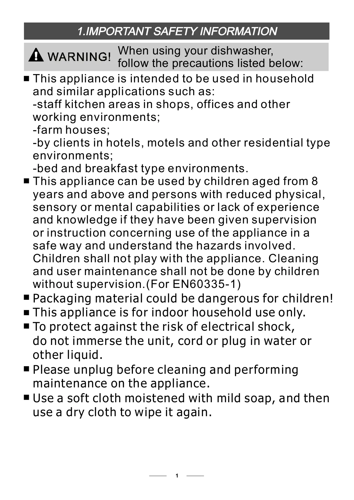 - Technical information When using your dishwasher, follow the precautions listed below: This appliance is intended to be used in household and similar applications such as: -staff kitchen areas in shops, offices and other working environments; -farm houses; -by clients in hotels, motels and other residential type environments; -bed and breakfast type environments. This appliance can be used by children aged from 8 years and above and persons with reduced physical, sensory or mental capabilities or lack of experience and knowledge if they have been given supervision or instruction concerning use of the appliance in a safe way and understand the hazards involved. Children shall not play with the appliance. Cleaning and user maintenance shall not be done by children without supervision.(For EN60335-1) Packaging material could be dangerous for children! This appliance is for indoor household use only. To protect against the risk of electrical shock, do not immerse the unit, cord or plug in water or other liquid. Please unplug before cleaning and performing maintenance on the appliance. Use a soft cloth moistened with mild soap, and then use a dry cloth to wipe it again. p. 27