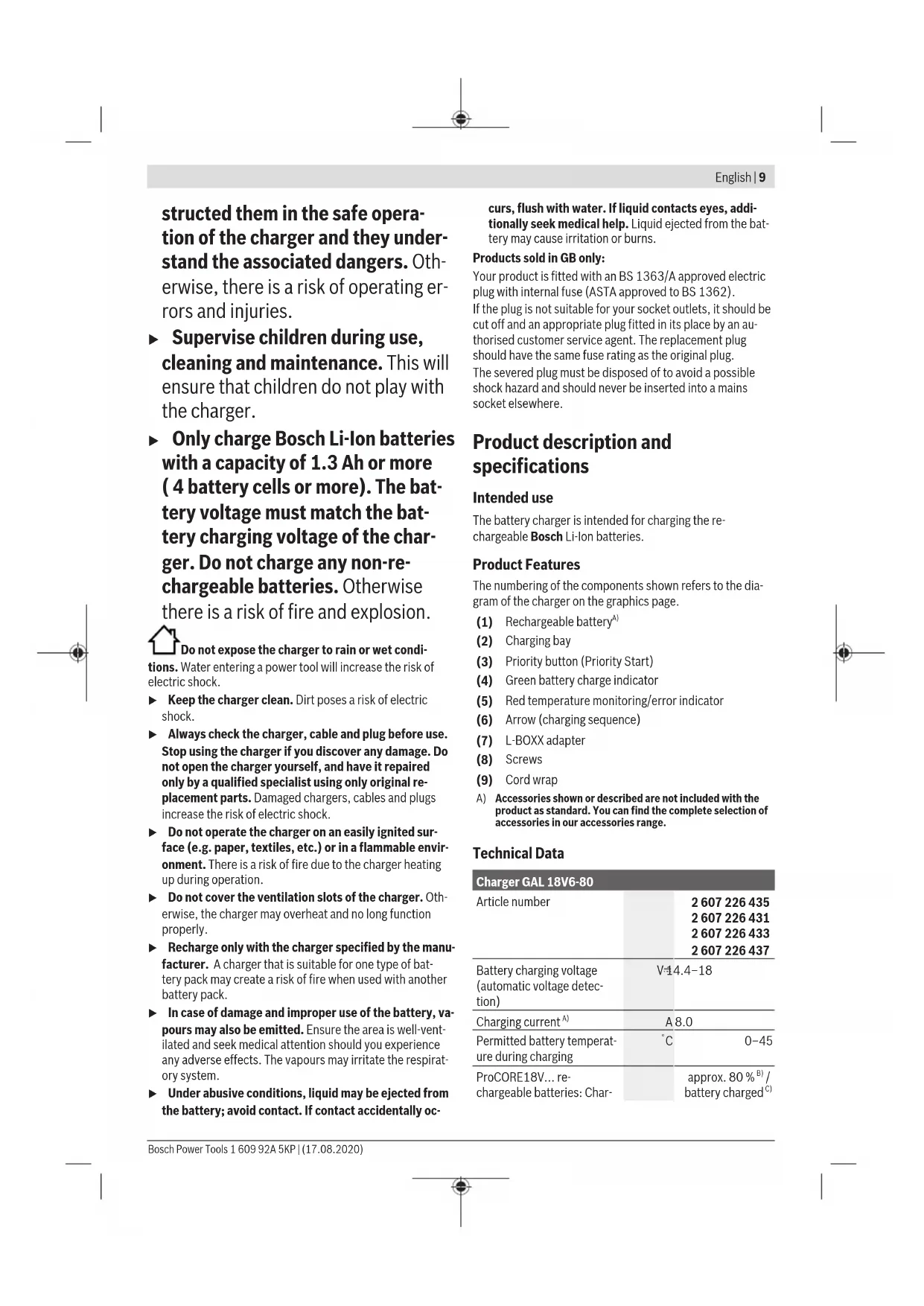Accessories shown or described are not included with the product as standard. You can find the complete selection of accessories in our accessories range. Technical Data Charger GAL 18V6-80 Article number