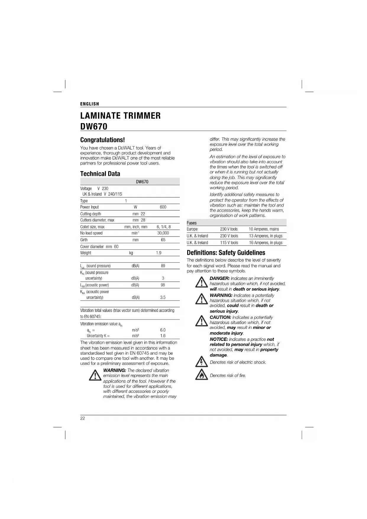 LAMINATE TRIMMER DW670 Congratulations! You have chosen a DEWALT tool. Years of experience, thorough product development and innovation make DEWALT one of the most reliable partners for professional power tool users. Technical Data DW670 Voltage V 230 UK & Ireland V 240/115 Type 1 Power Input W 600 Cutting depth mm 22 Cutters diameter, max mm 28 Collet size, max mm, inch, mm 6, 1/4, 8 No load speed min