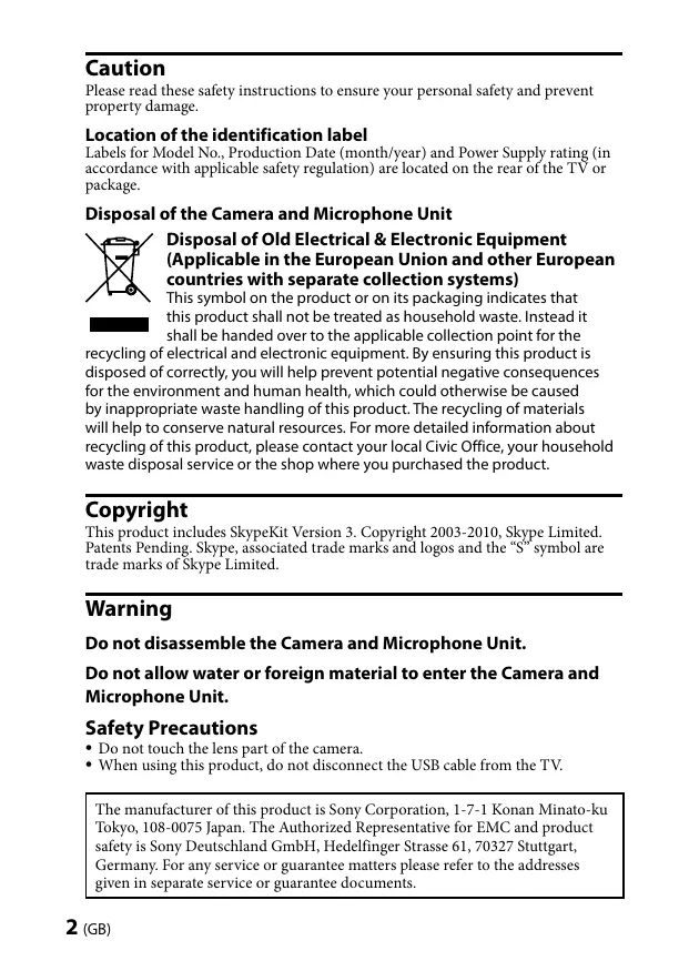 Do not touch the lens part of the camera. When using this product, do not disconnect the USB cable from the TV. The manufacturer of this product is Sony Corporation, 1-7-1 Konan Minato-ku Tokyo, 108-0075 Japan. The Authorized Representative for EMC and product safety is Sony Deutschland GmbH, Hedelfinger Strasse 61, 70327 Stuttgart, Germany. For any service or guarantee matters please refer to the addresses given in separate service or guarantee documents. (GB)