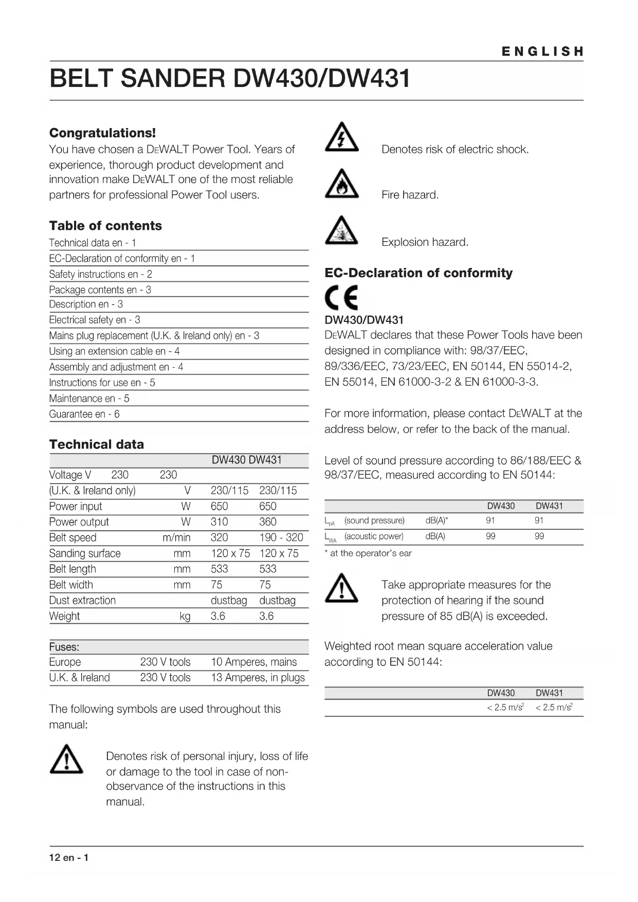 Congratulations! You have chosen a DEWALT Power Tool. Years of experience, thorough product development and innovation make DEWALT one of the most reliable partners for professional Power Tool users. Table of contents Technical data en - 1 EC-Declaration of conformity en - 1 Safety instructions en - 2 Package contents en - 3 Description en - 3 Electrical safety en - 3 Mains plug replacement (U.K. & Ireland only) en - 3 Using an extension cable en - 4 Assembly and adjustment en - 4 Instructions for use en - 5 Maintenance en - 5 Guarantee en - 6 Technical data DW430 DW431 Voltage V 230 230 (U.K. & Ireland only) V 230/115 230/115 Power input W 650 650 Power output W 310 360 Belt speed m/min 320 190 - 320 Sanding surface mm 120 x 75 120 x 75 Belt length mm 533 533 Belt width mm 75 75 Dust extraction dustbag dustbag Weight kg 3.6 3.6 Fuses: Europe 230 V tools 10 Amperes, mains U.K. & Ireland 230 V tools 13 Amperes, in plugs The following symbols are used throughout this manual: Denotes risk of personal injury, loss of life or damage to the tool in case of non- observance of the instructions in this manual. Denotes risk of electric shock. Fire hazard. Explosion hazard. EC-Declaration of conformity DW430/DW431 DEWALT declares that these Power Tools have been designed in compliance with: 98/37/EEC, 89/336/EEC, 73/23/EEC, EN 50144, EN 55014-2, EN 55014, EN 61000-3-2 & EN 61000-3-3. For more information, please contact DEWALT at the address below, or refer to the back of the manual. Level of sound pressure according to 86/188/EEC & 98/37/EEC, measured according to EN 50144: DW430 DW431