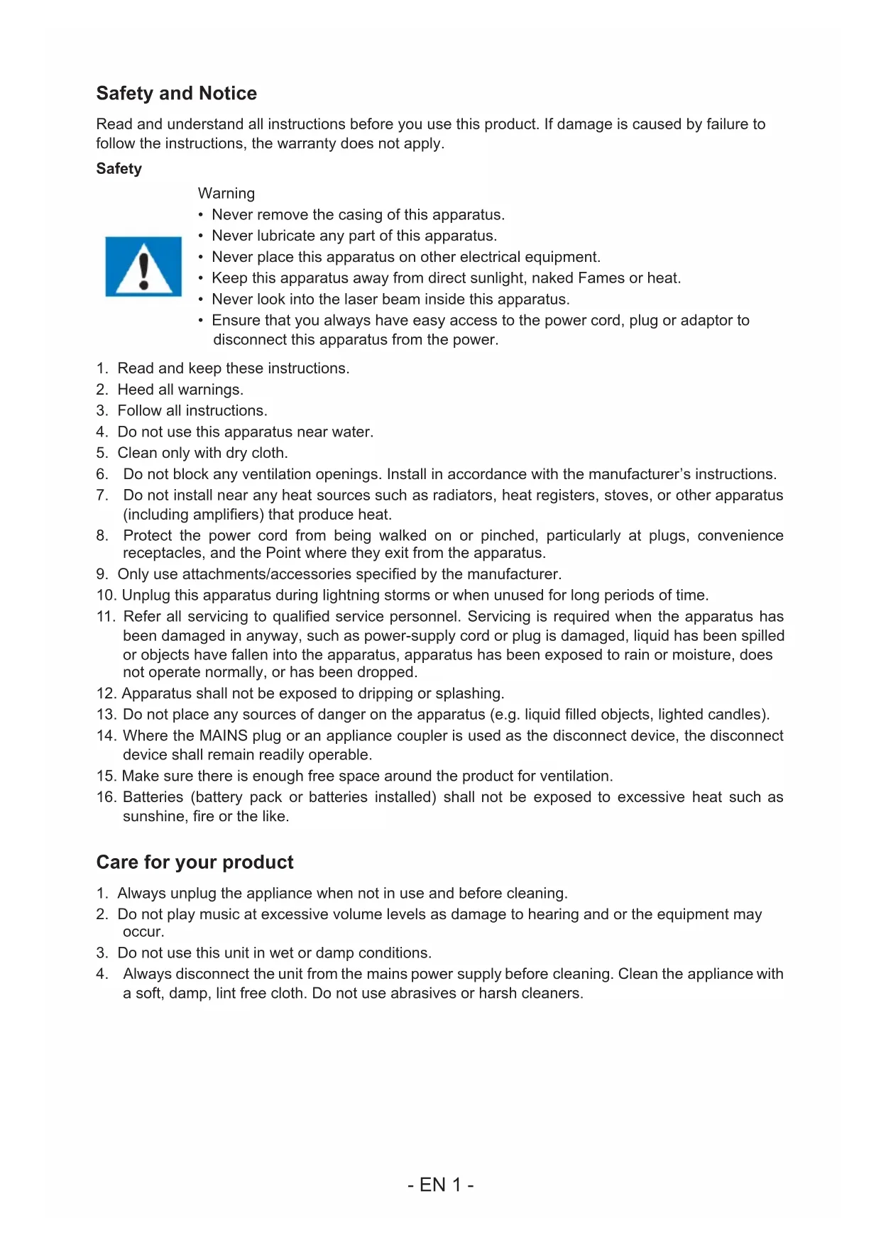 FUTURE REFERENCE EN- EN 1 - Safety and Notice Read and understand all instructions before you use this product. If damage is caused by failure to follow the instructions, the warranty does not apply. Safety Warning