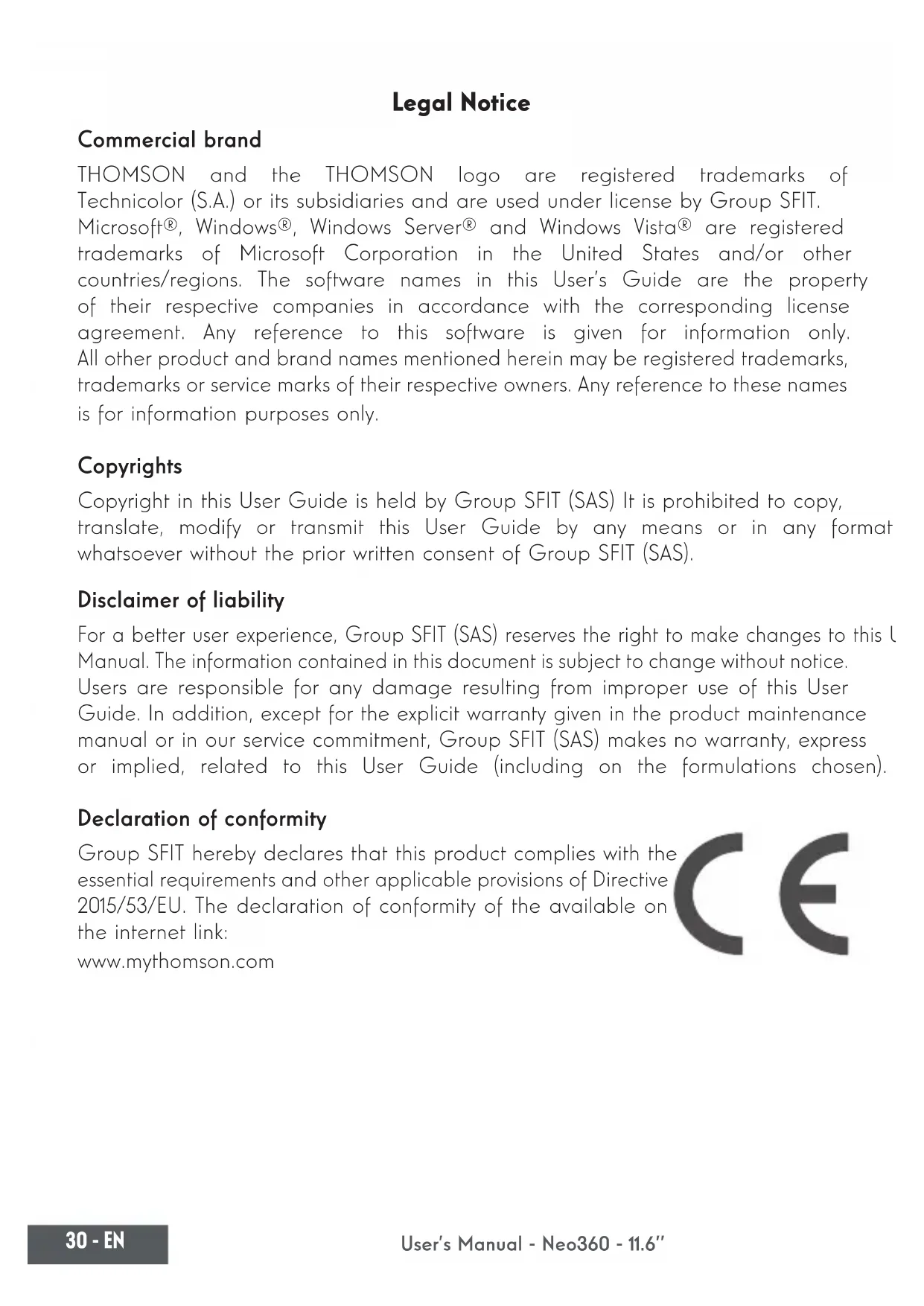 User’s Manual - Neo360 - 11.6’’ mythomson.com Legal Notice Commercial brand THOMSON and the THOMSON logo are registered trademarks of Technicolor (S.A.) or its subsidiaries and are used under license by Group SFIT. Microsoft®, Windows®, Windows Server® and Windows Vista® are registered trademarks of Microsoft Corporation in the United States and/or other countries/regions. The software names in this User’s Guide are the property of their respective companies in accordance with the corresponding license agreement. Any reference to this software is given for information only. All other product and brand names mentioned herein may be registered trademarks, trademarks or service marks of their respective owners. Any reference to these names is for information purposes only. Copyrights Copyright in this User Guide is held by Group SFIT (SAS) It is prohibited to copy, translate, modify or transmit this User Guide by any means or in any format whatsoever without the prior written consent of Group SFIT (SAS). Disclaimer of liability For a better user experience, Group SFIT (SAS) reserves the right to make changes to this User Manual. The information contained in this document is subject to change without notice. Users are responsible for any damage resulting from improper use of this User Guide. In addition, except for the explicit warranty given in the product maintenance manual or in our service commitment, Group SFIT (SAS) makes no warranty, express or implied, related to this User Guide (including on the formulations chosen). Declaration of conformity Group SFIT hereby declares that this product complies with the essential requirements and other applicable provisions of Directive 2015/53/EU. The declaration of conformity of the available on the internet link: www.mythomson.comEN - 31 mythomson.com - Important safety instructions - This unit should be used in an environment with an ambient temperature between 5°C (41°F) and 35°C (95°F). Do not expose the unit to rain or moisture and keep it away from liquids. In case of splashing water or other liquid on the unit, immediately switch off the unit and wait until it is completely dry before turning it on again. Do not expose the device directly to solar radiation Do not use strong solvents, liquid detergents or other chemicals on or near the surface of the unit to prevent corrosion or deterioration of the surface of the unit. Do not expose the camera to a dusty environment. Do not use the unit during a gas leak. Do not expose the device to strong magnetic or electric elds. You can run the device through airport x-ray detectors. However, it is recommended not to pass your device through the magnetic detection portals or expose it to portable detectors. Do not place any objects on the device. Do not place the unit on an uneven or unstable surface. Make sure to protect the unit from falls or any other impact that may damage it. Do not leave the appliance on or loaded on your lap or any other part of your body to avoid any risk of heat-related injuries. Switch off the unit before transporting it or covering it with a material that does not allow optimal air circulation. Do not use damaged power cords, accessories or other devices with your device. We recommend the exclusive use of the accessories (power supply, cables, etc.) supplied with the unit. Use only original batteries. Replacing the battery with an incorrect battery can cause an explosion risk.32 - EN User’s Manual - Neo360 - 11.6’’ mythomson.com Do not disassemble, modify or repair the unit yourself, as this may void the warranty. Please back up your important content regularly to avoid data loss. Our company accepts no responsibility for the loss or removal of items contained in the device due to improper use of the hardware or software, lack of maintenance or any other accidental event. At full volume, prolonged listening to the portable audio device may damage the user’s hearing. This product has been designed to allow proper recycling of parts and components. The symbol representing a crossed-out wheeled bin indicates that the device should not be disposed of with municipal waste. Consult local regulations for disposal of electronic devices. The symbol representing a crossed-out wheeled bin indicates that the battery should not be disposed of with municipal waste. Consult local regulations for battery disposal.EN - 33 mythomson.com - Presentation of the device - Front view Note : The presentation of the device and some features may vary by country, model or version.