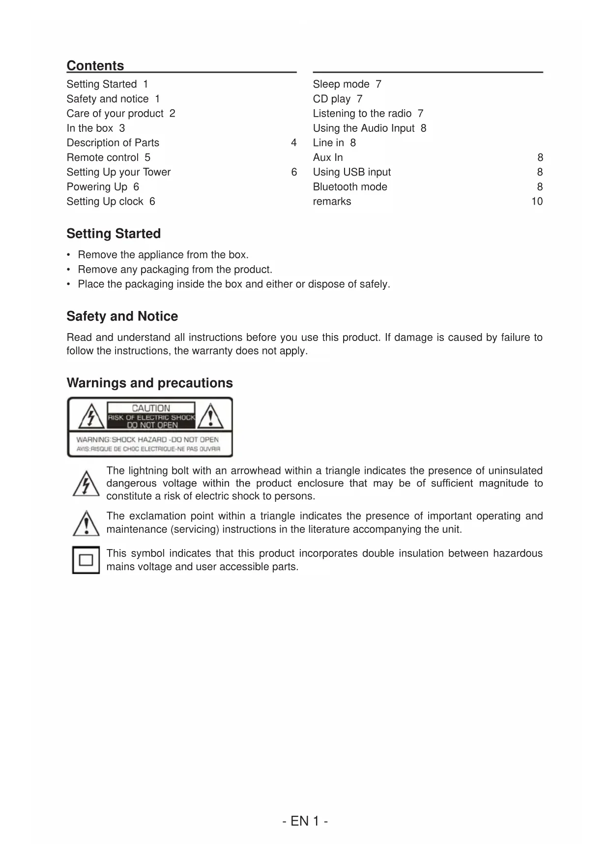 arnings and precautions The lightning bolt with an arrowhead within a triangle indicates the presence of uninsulated dangerous voltage within the product enclosure that may be of sufcient magnitude to constitute a risk of electric shock to persons. The exclamation point within a triangle indicates the presence of important operating and maintenance (servicing) instructions in the literature accompanying the unit. This symbol indica tes that this product incorporates double insulation between hazardous mains voltage and user accessible parts.- EN 2 - Important safety instructions