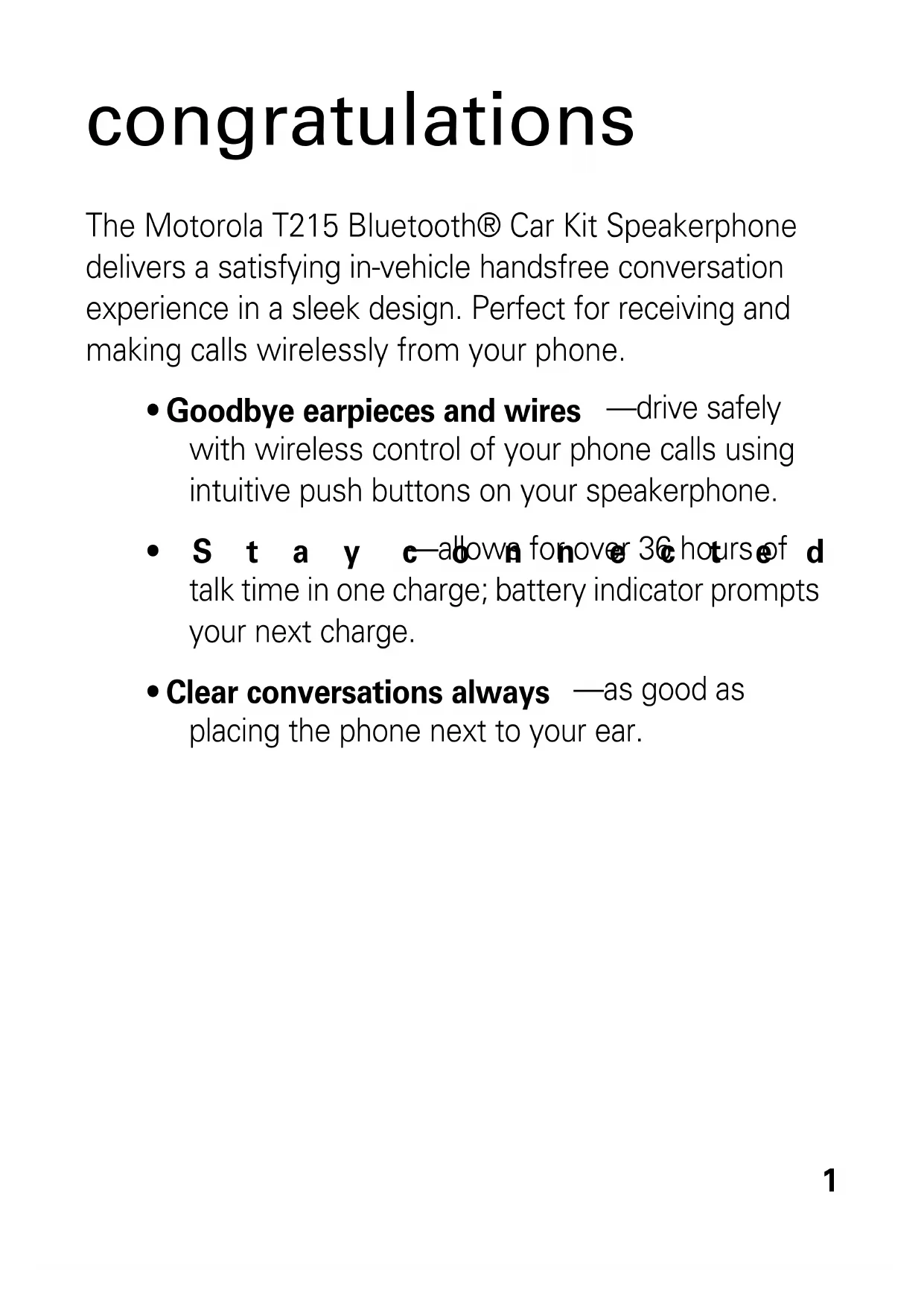 Quick Start Guide motorola T2151 congratulations The Motorola T215 Bluetooth® Car Kit Speakerphone delivers a satisfying in-vehicle handsfree conversation experience in a sleek design. Perfect for receiving and making calls wirelessly from your phone.