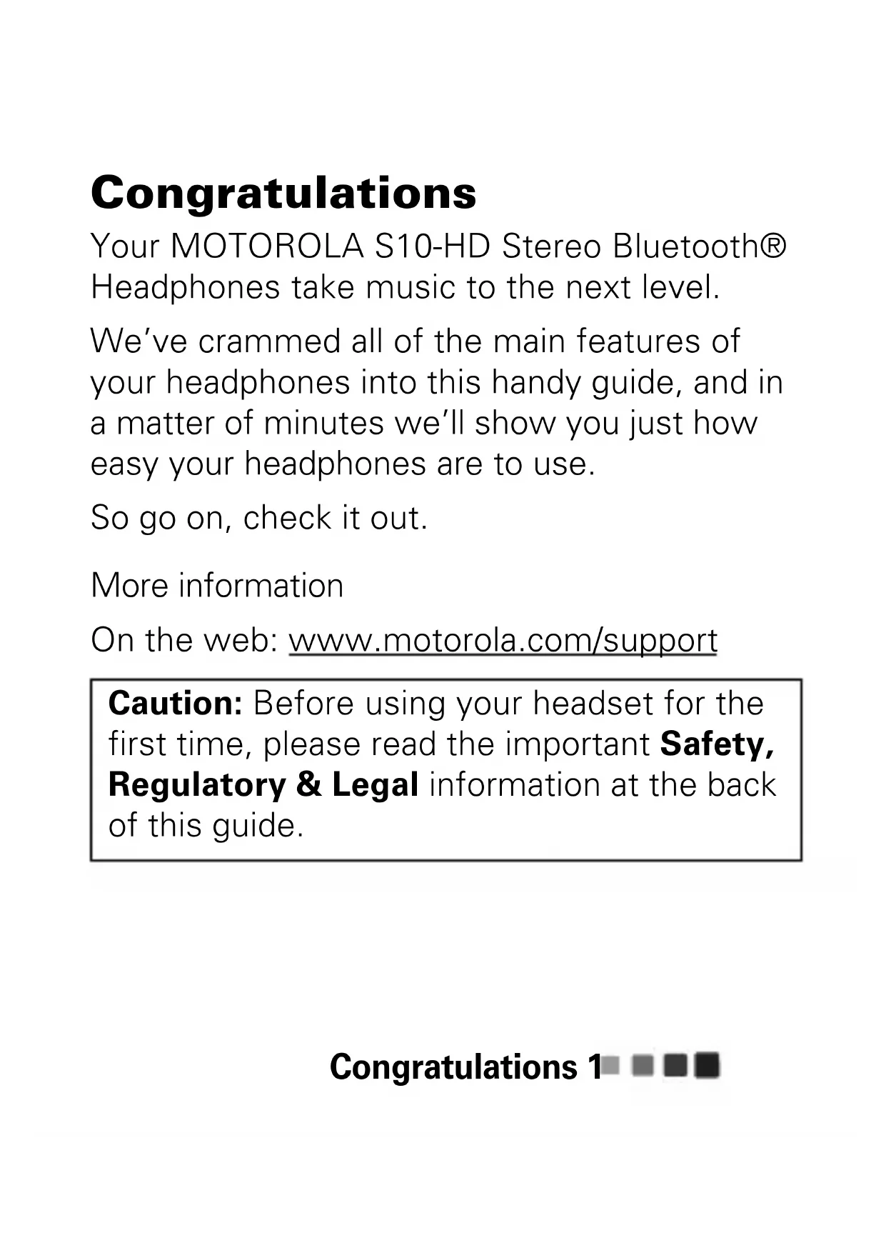 Quick Start Guide MOTOROLA S10-HDCongratulations 1 Congratulations Your MOTOROLA S10-HD Stereo Bluetooth® Headphones take music to the next level. We’ve crammed all of the main features of your headphones into this handy guide, and in a matter of minutes we’ll show you just how easy your headphones are to use. So go on, check it out. More information On the web: www.motorola.com/support Caution: Before using your headset for the first time, please read the important Safety, Regulatory & Legal information at the back of this guide.Your headphones2 Your headphones the important parts Microphone