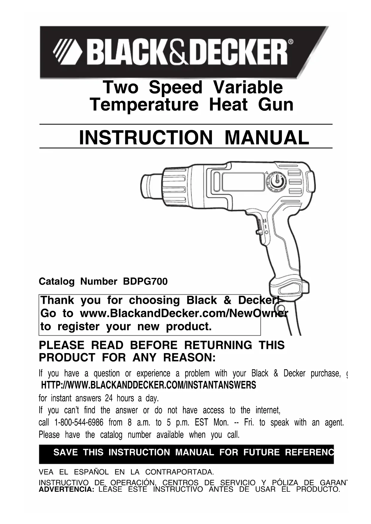 Catalog Number BDPG700 INSTRUCTION MANUAL Two Speed Variable Temperature Heat Gun Thank you for choosing Black & Decker! Go to www.BlackandDecker.com/NewOwner to register your new product.