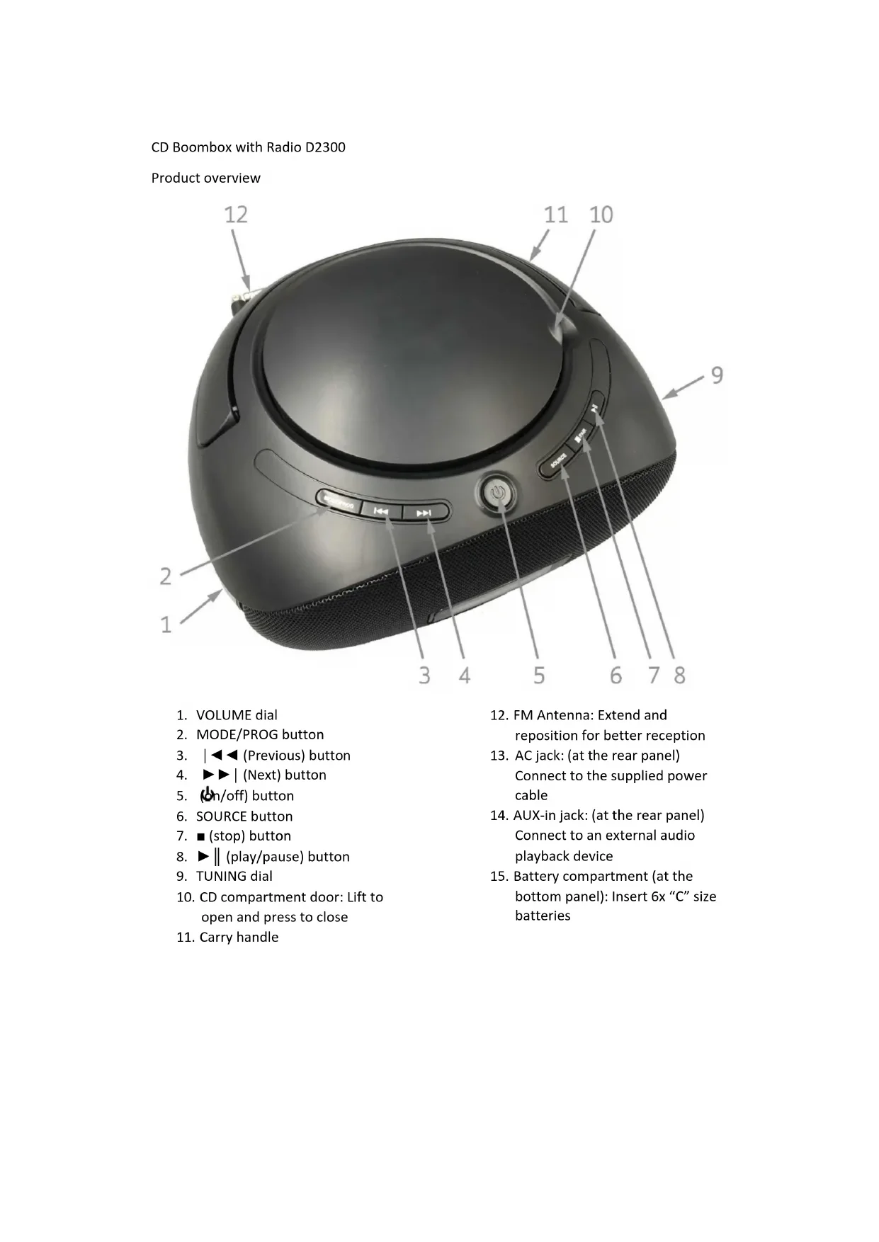 Electric and electronic equipment contains materials, components and substances that can be hazardous to your health and the environment, if the waste material (discarded electric and electronic equipment) is not handled correctly. Electric and electronic equipment is marked with the crossed out trash can symbol, seen above. This symbol signifies that electric and electronic equipment should not be disposed of with other household waste, but should be disposed of separately. All cities have established collection points, where electric and electronic equipment can either be submitted free of charge at recycling stations and other collection sites, or be collected from the households. Additional information is available at the technical department of your city. Hereby, Inter Sales A/S declares that the radio equipment type TC-29 is in compliance with Directive 2014/53/EU. The full text of the EU declaration of conformity is available at the following internet address: http://www.denver-electronics.com/denver-tc-29/ Operating Frequency Range: Max Output Power: DENVER ELECTRONICS A/SOmega 5A, Soeften DK-8382 Hinnerup Denmark www.facebook.com/denverelectronicsRadio-CD D2300 Vue d’ensemble du produit