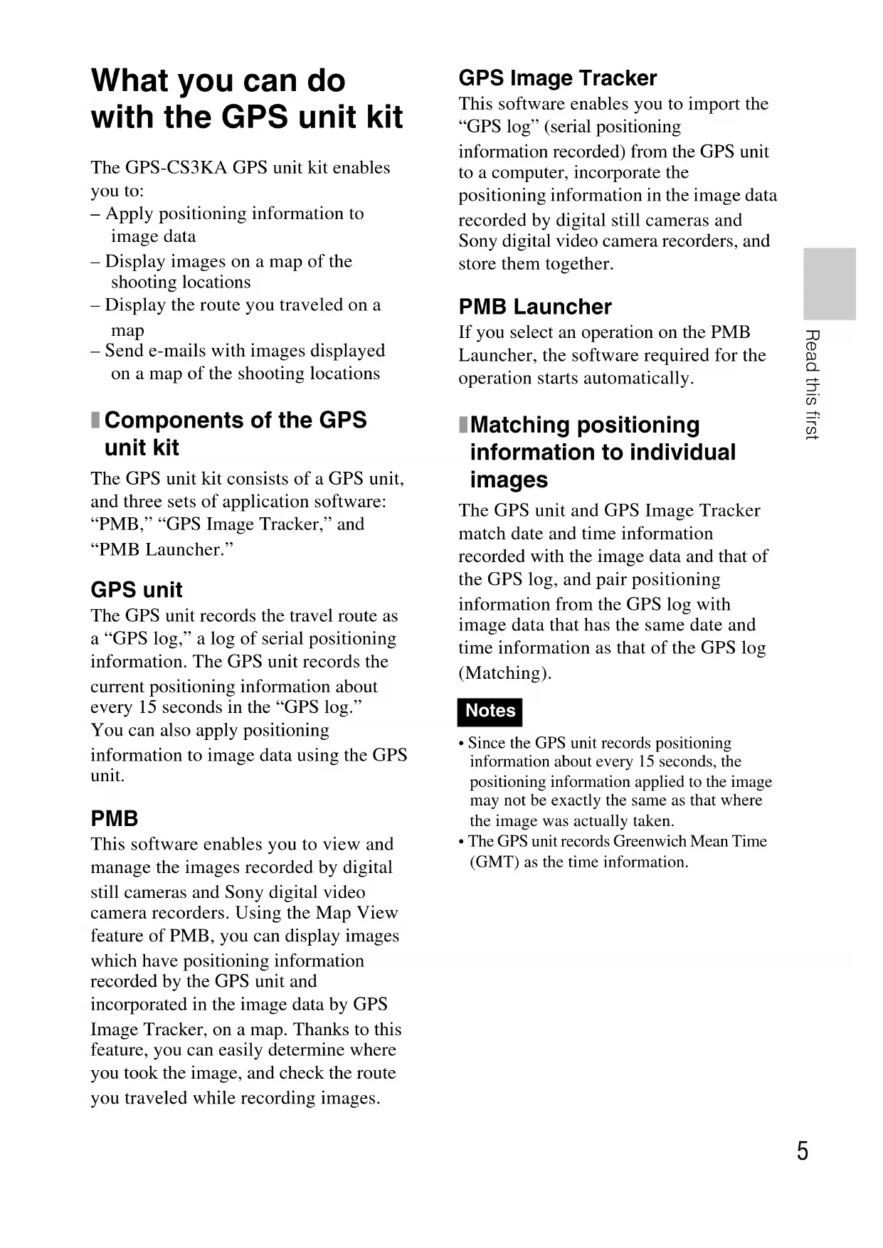 Components of the GPS unit kit The GPS unit kit consists of a GPS unit, and three sets of application software: “PMB,” “GPS Image Tracker,” and “PMB Launcher.” GPS unit The GPS unit records the travel route as a “GPS log,” a log of serial positioning information. The GPS unit records the current positioning information about every 15 seconds in the “GPS log.” You can also apply positioning information to image data using the GPS unit. PMB This software enables you to view and manage the images recorded by digital still cameras and Sony digital video camera recorders. Using the Map View feature of PMB, you can display images which have positioning information recorded by the GPS unit and incorporated in the image data by GPS Image Tracker, on a map. Thanks to this feature, you can easily determine where you took the image, and check the route you traveled while recording images. GPS Image Tracker This software enables you to import the “GPS log” (serial positioning information recorded) from the GPS unit to a computer, incorporate the positioning information in the image data recorded by digital still cameras and Sony digital video camera recorders, and store them together. PMB Launcher If you select an operation on the PMB Launcher, the software required for the operation starts automatically.