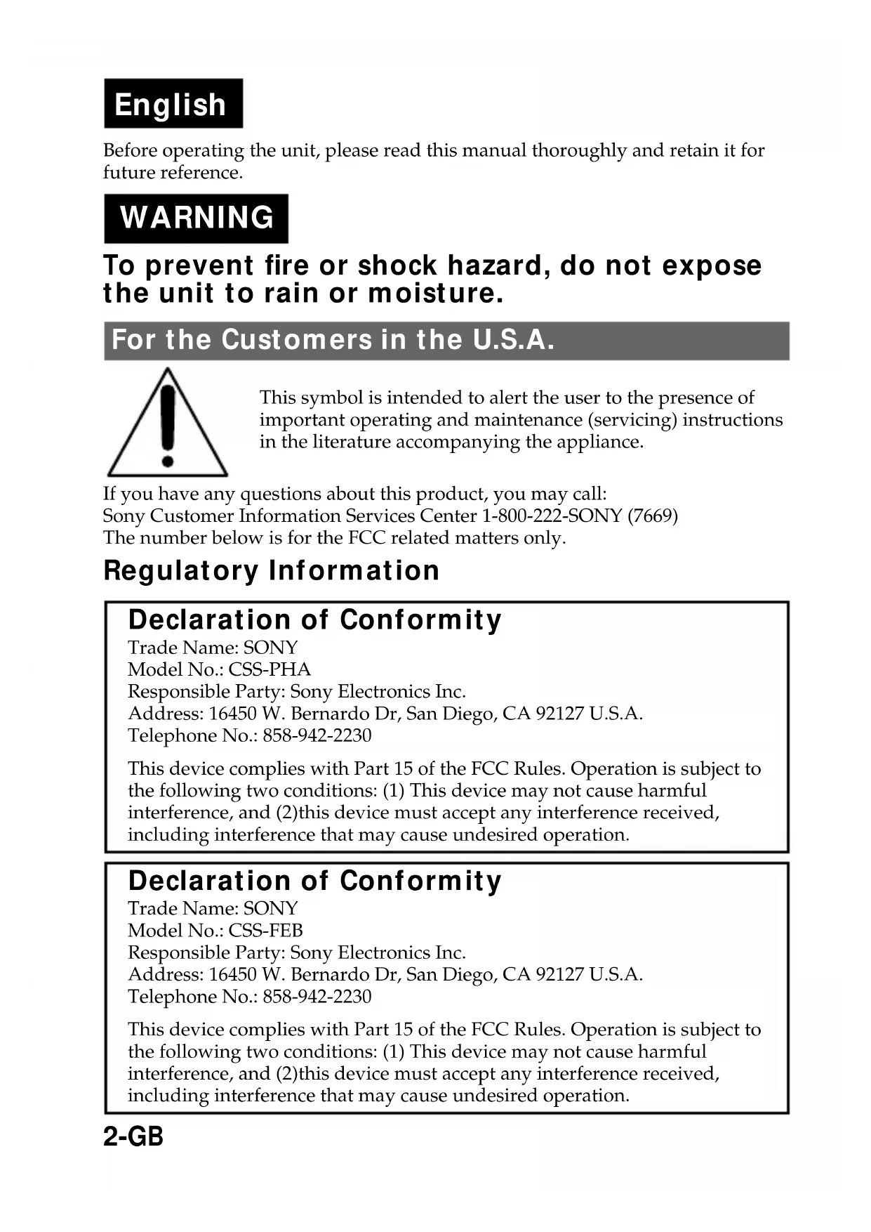 - FR2-GB English Before operating the unit, please read this manual thoroughly and retain it for future reference. WARNING To prevent fire or shock hazard, do not expose the unit to rain or moisture. For the Customers in the U.S.A. This symbol is intended to alert the user to the presence of important operating and maintenance (servicing) instructions in the literature accompanying the appliance. If you have any questions about this product, you may call: Sony Customer Information Services Center 1-800-222-SONY (7669) The number below is for the FCC related matters only. Regulatory Information Declaration of Conformity Trade Name: SONY Model No.: CSS-PHA Responsible Party: Sony Electronics Inc. Address: 16450 W. Bernardo Dr, San Diego, CA 92127 U.S.A. Telephone No.: 858-942-2230 This device complies with Part 15 of the FCC Rules. Operation is subject to the following two conditions: (1) This device may not cause harmful interference, and (2)this device must accept any interference received, including interference that may cause undesired operation. Declaration of Conformity Trade Name: SONY Model No.: CSS-FEB Responsible Party: Sony Electronics Inc. Address: 16450 W. Bernardo Dr, San Diego, CA 92127 U.S.A. Telephone No.: 858-942-2230 This device complies with Part 15 of the FCC Rules. Operation is subject to the following two conditions: (1) This device may not cause harmful interference, and (2)this device must accept any interference received, including interference that may cause undesired operation.3-GB CAUTION You are cautioned that any changes or modifications not expressly approved in this manual could void your authority to operate this equipment. Note: This equipment has been tested and found to comply with the limits for a Class B digital device, pursuant to Part 15 of the FCC Rules. These limits are designed to provide reasonable protection against harmful interference in a residential installation. This equipment generates, uses, and can radiate radio frequency energy and, if not installed and used in accordance with the instructions, may cause harmful interference to radio communications. However, there is no guarantee that interference will not occur in a particular installation. If this equipment does cause harmful interference to radio or television reception, which can be determined by turning the equipment off and on, the user is encouraged to try to correct the interference by one or more of the following measures: —Reorient or relocate the receiving antenna. —Increase the separation between the equipment and receiver. —Connect the equipment into an outlet on a circuit different from that to which the receiver is connected. —Consult the dealer or an experienced radio/TV technician for help. The supplied interface cable must be used with the equipment in order to comply with the limits for a digital device pursuant to Subpart B of Part 15 of FCC Rules. Attention for the Customers in Europe This product has been tested and found compliant with the limits sets out in the EMC Directive for using connection cables shorter than 3 meters (9.8 feet). Attention The electromagnetic field at the specific frequencies may influence the picture and sound of this camera. Notice If static electricity or electromagnetism causes data transfer to discontinue midway (fail), restart the application or disconnect and connect the USB cable again. Notice Certain countries and regions may regulate disposal of the battery used to power this product. Please consult with your local authority.4-GB Features Easily view and print your photos via Cyber-shot Station. This convenient Cyber-shot Station is supplied with wireless remote cotrol for effort-less viewing on a TV. Also attaches to PictBridge enabled printers and USB enabled computers. In-camera charging while stationed. The CSS-PHA can be used with the DSC-P100 digital still camera. The CSS-FEB can be used with the DSC-F88 digital still camera. *The illustrations of the CSS-PHA are mainly used in this operating instructions. However, these illustrations are applied to the CSS-FEB. An AC adaptor is not supplied. Use either the AC adaptor (AC-LS5/LS5B) comes with the Cyber-shot (DSC-P100/DSC-F88), or an optional AC adaptor (AC-LS5). zYou can easily view photos on a TV screen by remote control (p.15). zThe buttons on the Remote Commander have the same functions as those on your camera (p.13). Using the remote control, you can operate the followings; – Viewing images – Slide Show – Trimming images – Playback zoom For further details, see the operating instructions supplied with the camera.5-GB Precautions p. 6