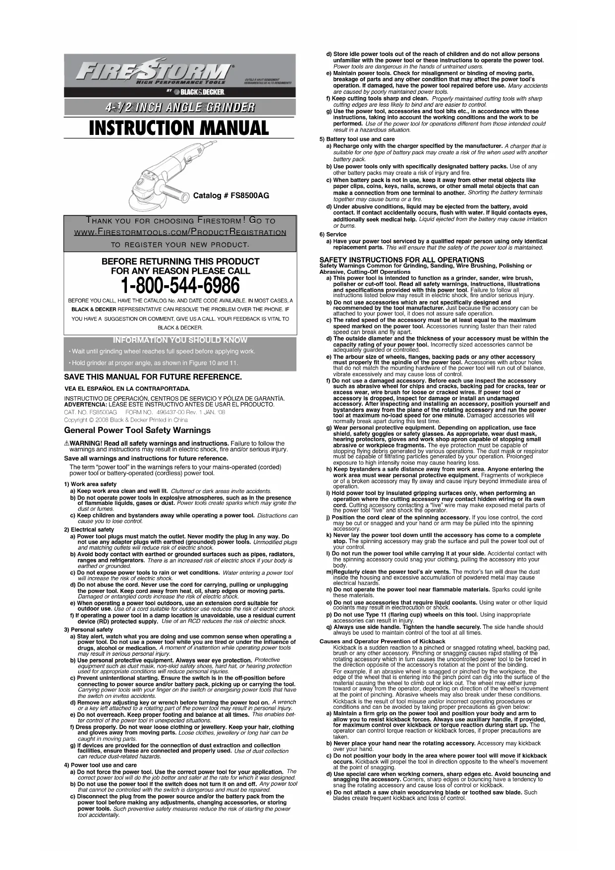 hazardous. Service Information Black & Decker offers a full network of company-owned and authorized service locations throughout North America. All Black & Decker Service Centers are staffed with trained personnel to provide customers with efficient and reliable power tool service. Whether you need technical advice, repair, or genuine factory replacement parts, contact the Black & Decker location nearest you. To find your local service location, refer to the yellow page directory under "Tools—Electric" or call: 1-800-54-HOW TO. Full Two-Year Home Use Warranty Black & Decker (U.S.) Inc. warrants this product for two years against any defects in material or workmanship. The defective product will be replaced or repaired at no charge in either of two ways. The first, which will result in exchanges only, is to return the product to the retailer from whom it was purchased (provided that the store is a participating retailer). Returns should be made within the time period of the retailer’s policy for exchanges (usually 30 to 90 days after the sale). Proof of purchase may be required. Please check with the retailer for their specific return policy regarding returns that are beyond the time set for exchanges. The second option is to take or send the product (prepaid) to a Black & Decker owned or authorized Service Center for repair or replacement at our option. Proof of purchase may be required. Black & Decker owned and authorized Service Centers are listed under "Tools-Electric" in the yellow pages of the phone directory. This warranty does not apply to accessories. This warranty gives you specific legal rights and you may have other rights which vary from province to province. Should you have any questions, contact the manager of your nearest Black & Decker Service Center. This product is not intended for commercial use. FREE WARNING LABEL REPLACEMENT: If your warning labels become illegible or are missing, call 1-800-544-6986 for a free replacement. Special Warranty Note to Contractors: FIRESTORM