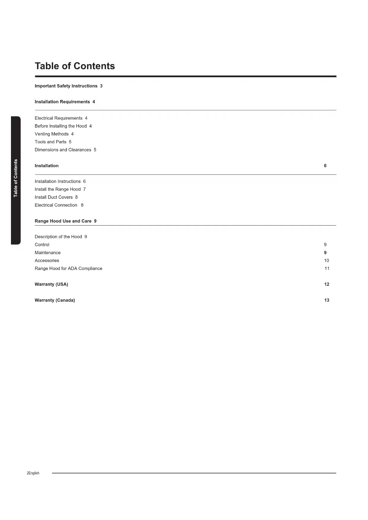 - Ductless (Recirculating) version ** Ducted version Installation Requirements Installation Requirements6 English Installation Instructions We recommend that a qualied technician install the range hood. It is the installer’s responsibility to ensure the range hood complies with the instal- lation clearances speciations for the product.