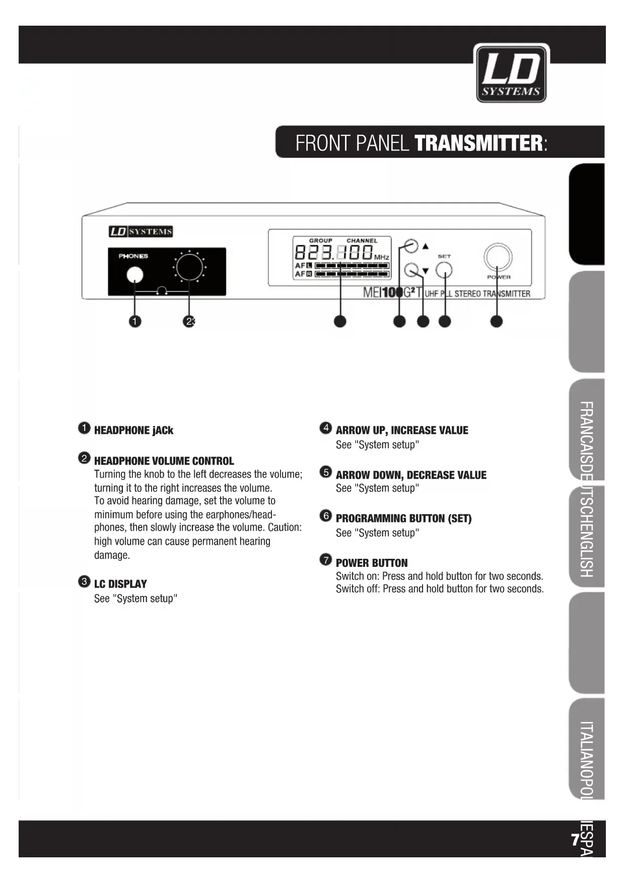 ENGLISHDEUTSCHFRANCAIS FRANCAISFRANCAIS FRANCAISFRANCAIS ESpAñoLpoLSKIITALIANo Thank you for choosing LD Systems! We have designed this product to operate reliably over many years. Therefore LD Systems guarantees for high quality products with its name and many years of experience as a producer. Please, take a few moments to read these instructions carefully, as we want you to enjoy your new LD Systems products quickly and to the fullest. For information about LD SYSTEMS check out our website WWW.LD-SYSTEMS.COM The new LD Systems MEI 100 G2 In-Ear Monitoring-System with 96 UHF channels with outstanding sound quality and a large dynamic range in the 823 - 832 and 863 - 865 MHz bands. The system toggles between mono and stereo mode for perfect monitoring for live musicians, actors or speakers. A built-in limiter ensures even, distortion-free sound reproduction with a frequency range of 80Hz - 15 kHz and stands out because of its high signal-to-noise ratio and low total harmonic distortion. The multifunctional displays of the transmitter and receiver indicates all important system statuses. With high quality batteries, it is possible to attain running times of 10 hours and more. The MEI 100 G2 package includes high-quality earphones, a 19" rackmount kit, and a rugged transport box made of ABS plastic.3 ITALIANOPOLSKIESPAÑOL FRANCAISFRANCAIS FRANCAISFRANCAIS FRANCAISDEUTSCHENGLISH PHONES MHz MHz