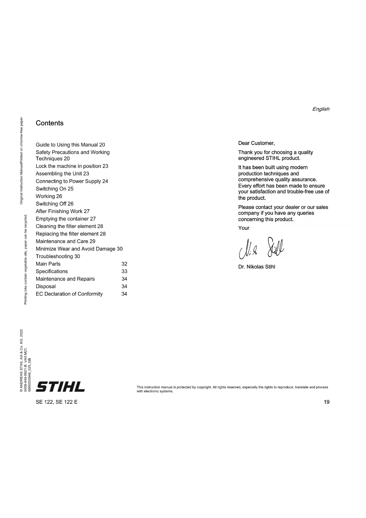 This instruction manual is protected by copyright. All rights reserved, especially the rights to reproduce, translate and process with electronic systems. Contents Dear Customer, Thank you for choosing a quality engineered STIHL product. It has been built using modern production techniques and comprehensive quality assurance. Every effort has been made to ensure your satisfaction and trouble-free use of the product. Please contact your dealer or our sales company if you have any queries concerning this product. Your Dr. Nikolas Stihl Guide to Using this Manual 20 Safety Precautions and Working Techniques 20 Lock the machine in position 23 Assembling the Unit 23 Connecting to Power Supply 24 Switching On 25 Working 26 Switching Off 26 After Finishing Work 27 Emptying the container 27 Cleaning the filter element 28 Replacing the filter element 28 Maintenance and Care 29 Minimize Wear and Avoid Damage 30 Troubleshooting 30 Main Parts 32 Specifications 33 Maintenance and Repairs 34 Disposal 34 EC Declaration of Conformity 34SE 122, SE 122 E English