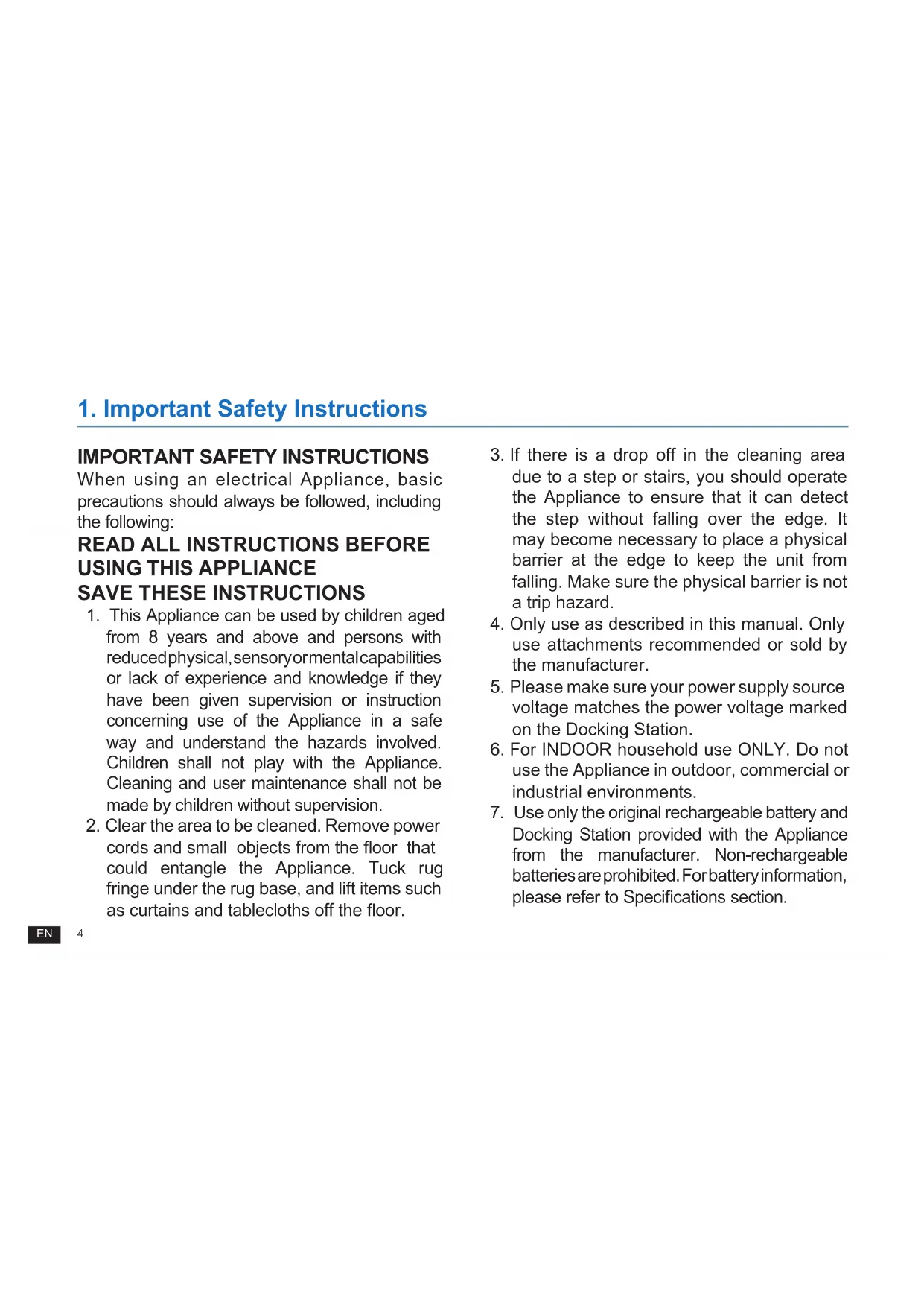 Docking Station provided with the Appliance from the manufacturer. Non-rechargeable batteries are prohibited. For battery information, please refer to Specications section.