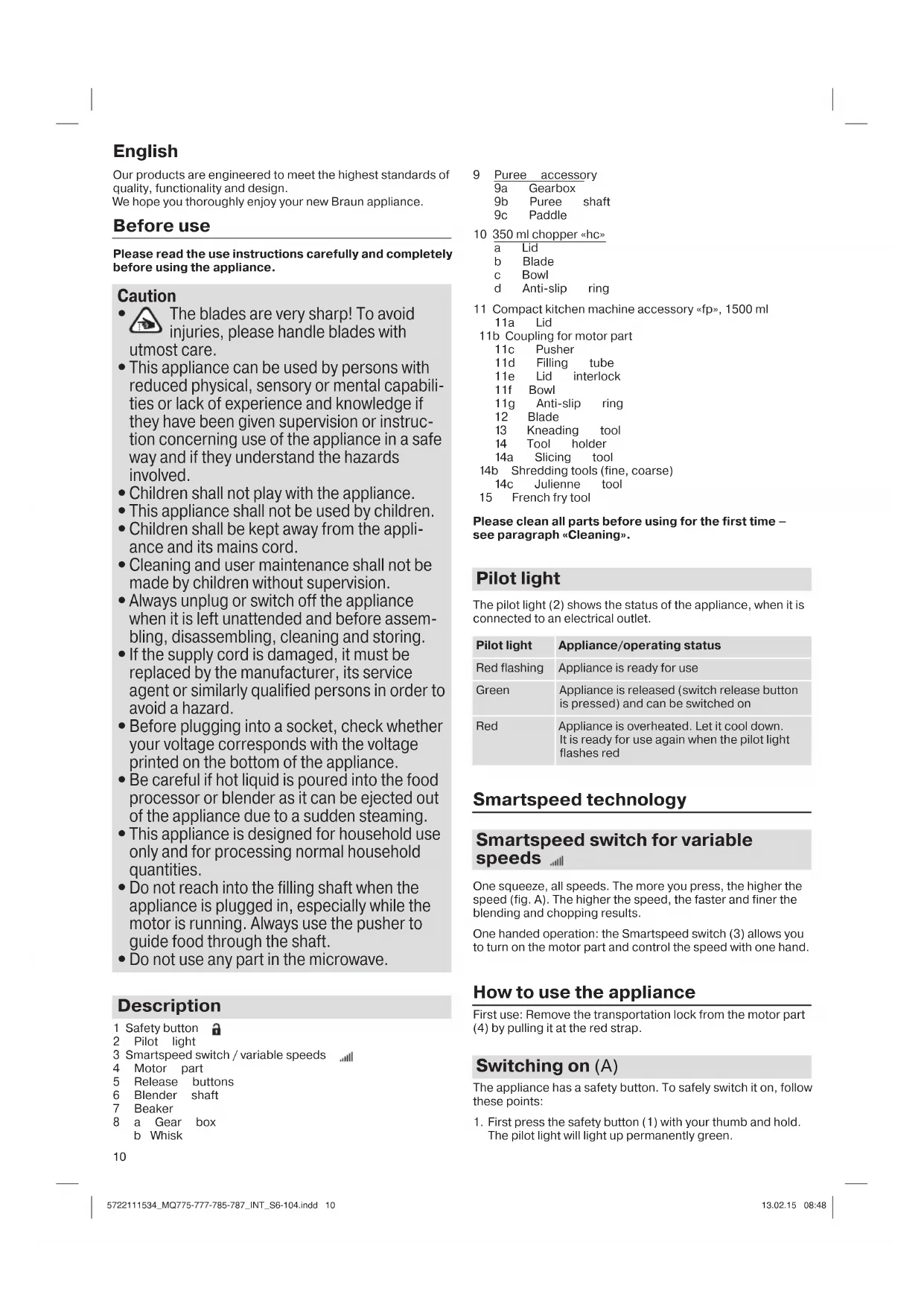 Do not use any part in the microwave. Description 1 Safety button 2 Pilot light 3 Smartspeed switch / variable speeds 4 Motor part 5 Release buttons 6 Blender shaft 7 Beaker 8 a Gear box b Whisk 9 Puree accessory 9a Gearbox 9b Puree shaft 9c Paddle 10 350 ml chopper «hc» a Lid b Blade c Bowl d Anti-slip ring 11 Compact kitchen machine accessory «fp», 1500 ml 11a Lid 11b Coupling for motor part 11c Pusher 11d Filling tube 11e Lid interlock 11f Bowl 11g Anti-slip ring 12 Blade 13 Kneading tool 14 Tool holder 14a Slicing tool 14b Shredding tools (fine, coarse) 14c Julienne tool 15 French fry tool Please clean all parts before using for the first time – see paragraph «Cleaning». Pilot light The pilot light (2) shows the status of the appliance, when it is connected to an electrical outlet. Pilot light Appliance/operating status Red flashing Appliance is ready for use Green Appliance is released (switch release button is pressed) and can be switched on Red Appliance is overheated. Let it cool down. It is ready for use again when the pilot light flashes red Smartspeed technology Smartspeed switch for variable speeds One squeeze, all speeds. The more you press, the higher the speed (fig. A). The higher the speed, the faster and finer the blending and chopping results. One handed operation: the Smartspeed switch (3) allows you to turn on the motor part and control the speed with one hand. How to use the appliance First use: Remove the transportation lock from the motor part (4) by pulling it at the red strap. Switching on (A) The appliance has a safety button. To safely switch it on, follow these points: