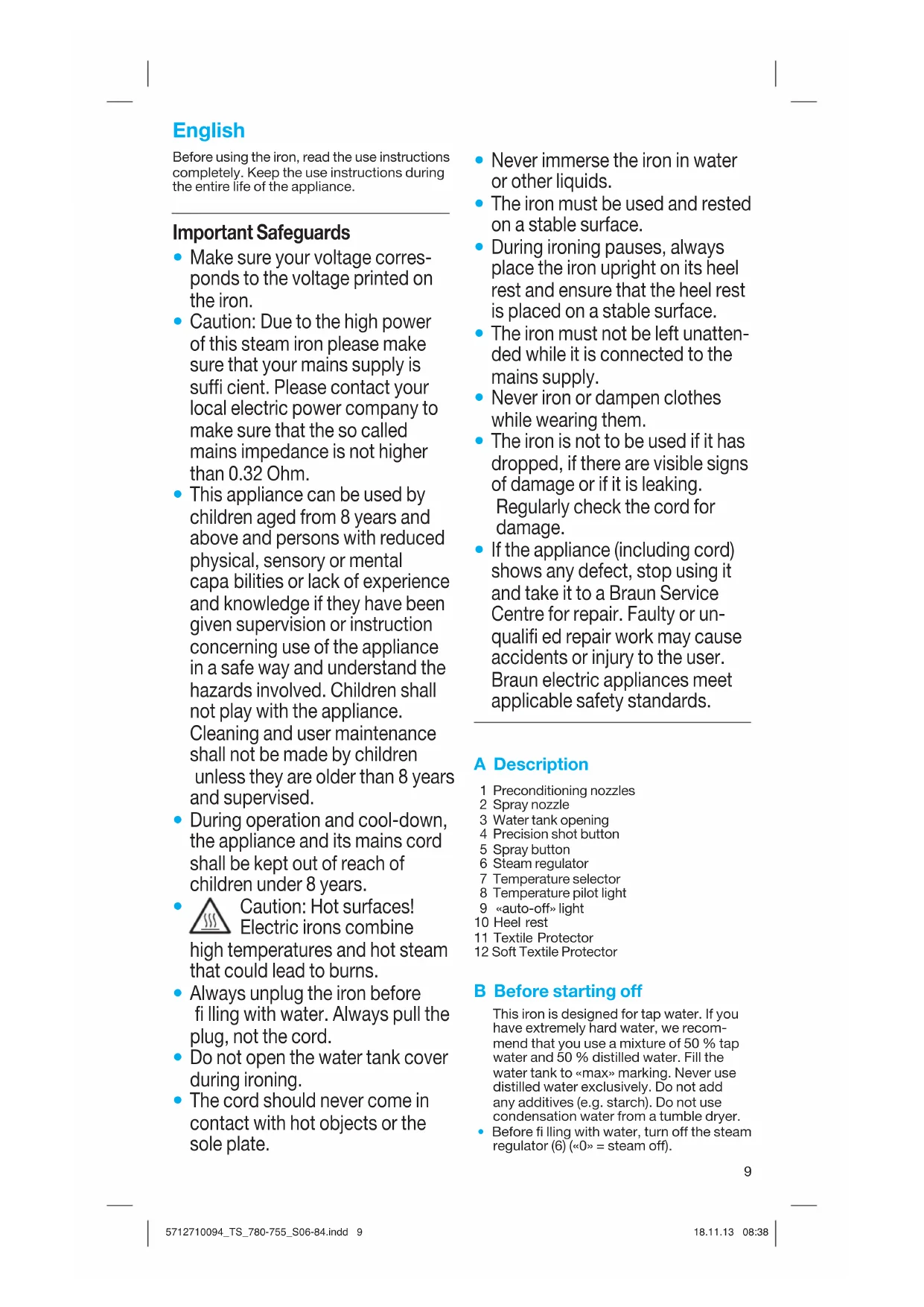 If the appliance (including cord) shows any defect, stop using it and take it to a Braun Service Centre for repair. Faulty or un- qualifi ed repair work may cause accidents or injury to the user. Braun electric appliances meet applicable safety standards. A Description 1 Preconditioning nozzles 2 Spray nozzle 3 Water tank opening 4 Precision shot button 5 Spray button 6 Steam regulator 7 Temperature selector 8 Temperature pilot light 9 «auto-off» light 10 Heel rest 11 Textile Protector 12 Soft Textile Protector B Before starting off This iron is designed for tap water. If you have extremely hard water, we recom- mend that you use a mixture of 50 % tap water and 50 % distilled water. Fill the water tank to «max» marking. Never use distilled water exclusively. Do not add any additives (e.g. starch). Do not use condensation water from a tumble dryer.