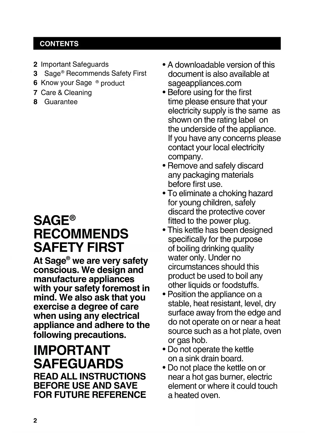 - Do not place the kettle on or near a hot gas burner, electric element or where it could touch a heated oven. 2 Important Safeguards 3 Sage