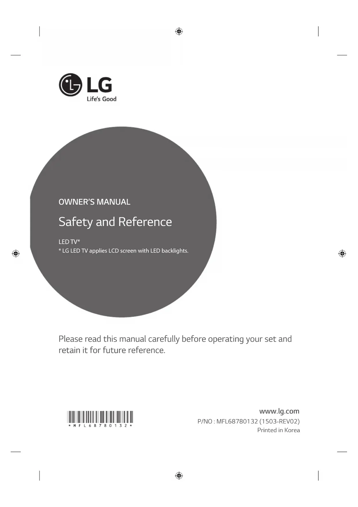 LED TV** LG LED TV applies LCD screen with LED backlights. *MFL68780132* P/NO : MFL68780132 (1503-REV02)Printed in Korea2 ENGLISH Safety instructions Please read these safety precautions carefully before using the product. WARNING Do not place the TV and/or remote control in the following environments: