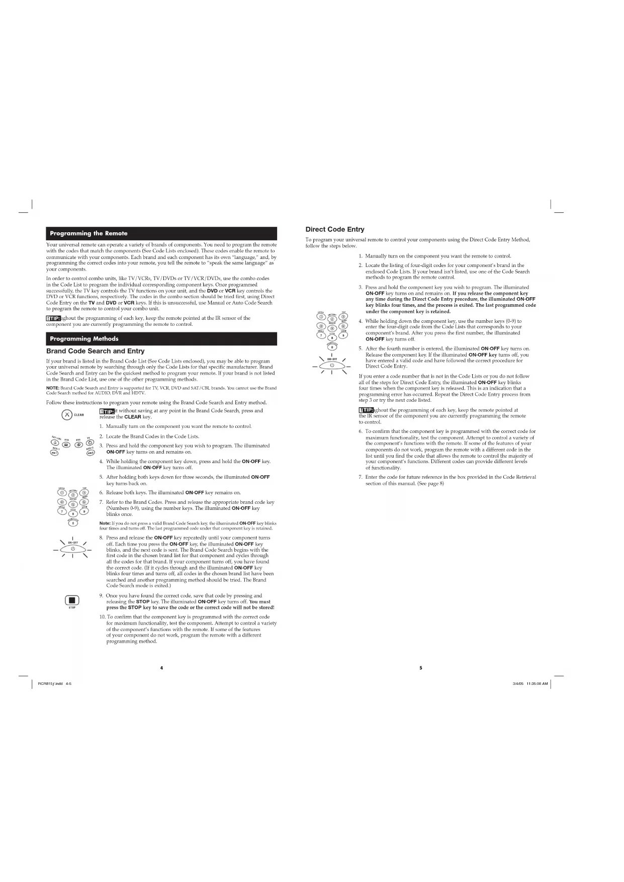 Note: Reprogramming may be required after batteries are replaced. Actual model may vary from picture shown.Component Keys (SAT·CBL, VCR, DVD, TV, AUX·1, AUDIO, DVR, AUX·2) LIGHT Key – Turns backlighting on/off (select models only).Illuminated ON·OFF Key – Serves as an indicator light to provide feedback.Transport Keys – REVERSE, PLAY, FORWARD, RECORD, STOP and PAUSE KeysCH and VOL keys have dual functions. They act as navigation keys (UP, DN, RT, LT ARROW keys) in menu systems.NAVIGATION Keys navigate through menus for DVDs, satellite receivers and some TVs.SELECT/OK Key – Selects your menu choices.Dedicated MENU Key for DVD disc menus, satellite receivers and some TVs.SLEEP Key - Allows you to set a time to turn off your TV automatically.INPUT Key – Toggles through all the video sources connected to your TV, when the remote is in TV mode. When the remote is in VCR mode, it toggles between VCR and TV input.INFO key – Displays information pertaining to the component you are currently controlling.MACRO Key Plus Digit Keys 1-6 – Enable you to store and execute Macros. RCR815ƒ.indd 2-3RCR815ƒ.indd 2-3 3/4/05 11:35:07 AM3/4/05 11:35:07 AM4 5 Programming the Remote Your universal remote can operate a variety of brands of components. You need to program the remote with the codes that match the components (See Code Lists enclosed). These codes enable the remote to communicate with your components. Each brand and each component has its own “language,” and, by programming the correct codes into your remote, you tell the remote to “speak the same language” as your components. In order to control combo units, like TV/VCRs, TV/DVDs or TV/VCR/DVDs, use the combo codes in the Code List to program the individual corresponding component keys. Once programmed successfully, the TV key controls the TV functions on your unit, and the DVD or VCR key controls the DVD or VCR functions, respectively. The codes in the combo section should be tried first, using Direct Code Entry on the TV and DVD or VCR keys. If this is unsuccessful, use Manual or Auto Code Search to program the remote to control your combo unit. Throughout the programming of each key, keep the remote pointed at the IR sensor of the component you are currently programming the remote to control. ! TIP: Programming Methods Brand Code Search and Entry If your brand is listed in the Brand Code List (See Code Lists enclosed), you may be able to program your universal remote by searching through only the Code Lists for that specific manufacturer. Brand Code Search and Entry can be the quickest method to program your remote. If your brand is not listed in the Brand Code List, use one of the other programming methods. NOTE: Brand Code Search and Entry is supported for TV, VCR, DVD and SAT/CBL brands. You cannot use the Brand Code Search method for AUDIO, DVR and HDTV. Follow these instructions to program your remote using the Brand Code Search and Entry method. To exit without saving at any point in the Brand Code Search, press and release the CLEAR key.