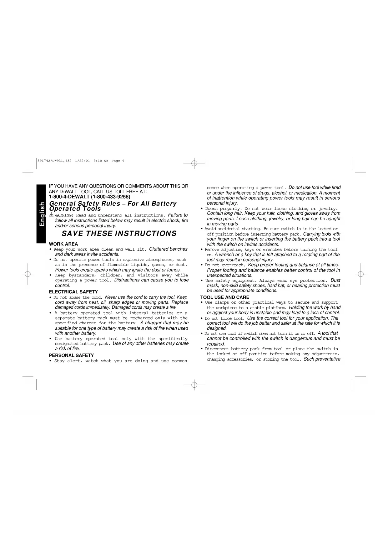 - Stay alert, watch what you are doing and use common English 391742/DW931,932 1/22/01 9:10 AM Page 4safety measures reduce the risk of starting the tool accidentally.