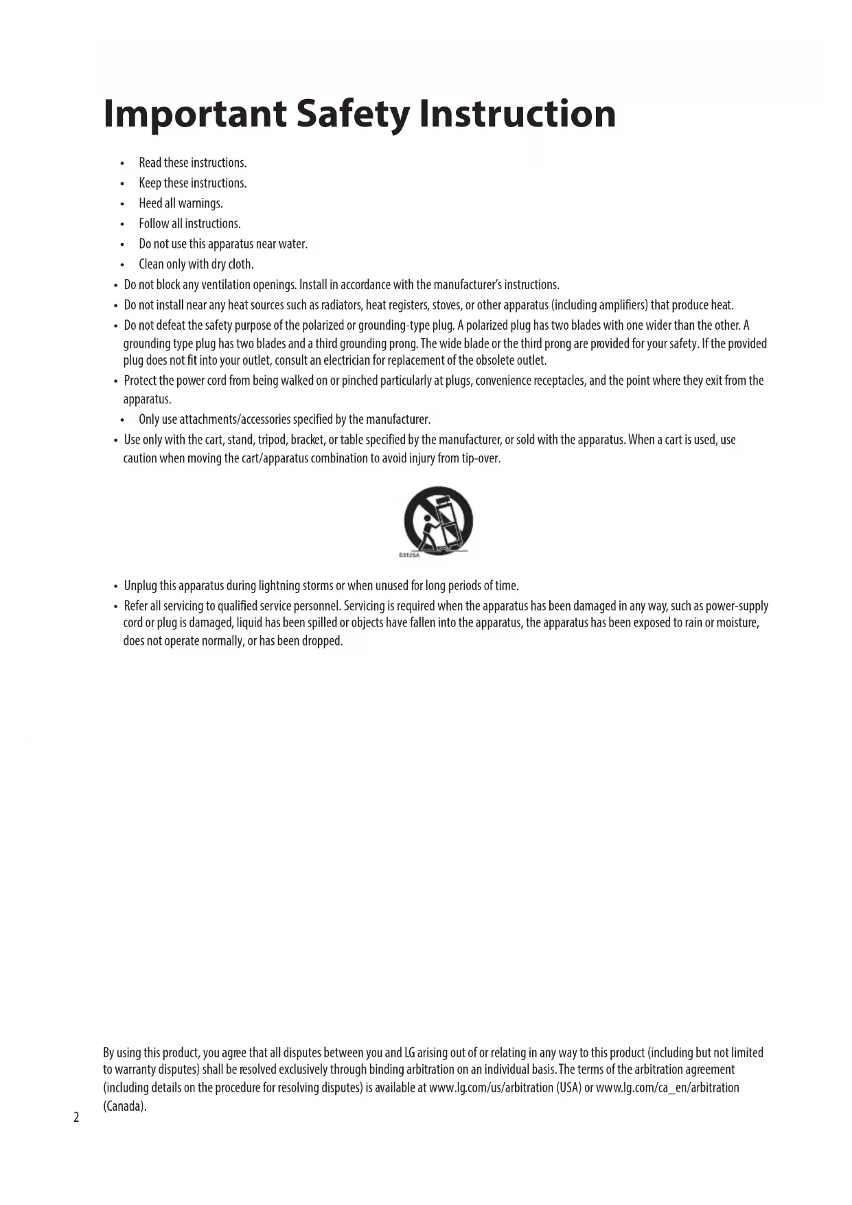 - Refer all servicing to qualified service personnel. Servicing is required when the apparatus has been damaged in any way, such as power-supply cord or plug is damaged, liquid has been spilled or objects have fallen into the apparatus, the apparatus has been exposed to rain or moisture, does not operate normally, or has been dropped. By using this product, you agree that all disputes between you and LG arising out of or relating in any way to this product (including but not limited to warranty disputes) shall be resolved exclusively through binding arbitration on an individual basis. The terms of the arbitration agreement (including details on the procedure for resolving disputes) is available at www.lg.com/us/arbitration (USA) or www.lg.com/ca_en/arbitration (Canada).3 Title Before reading this manual