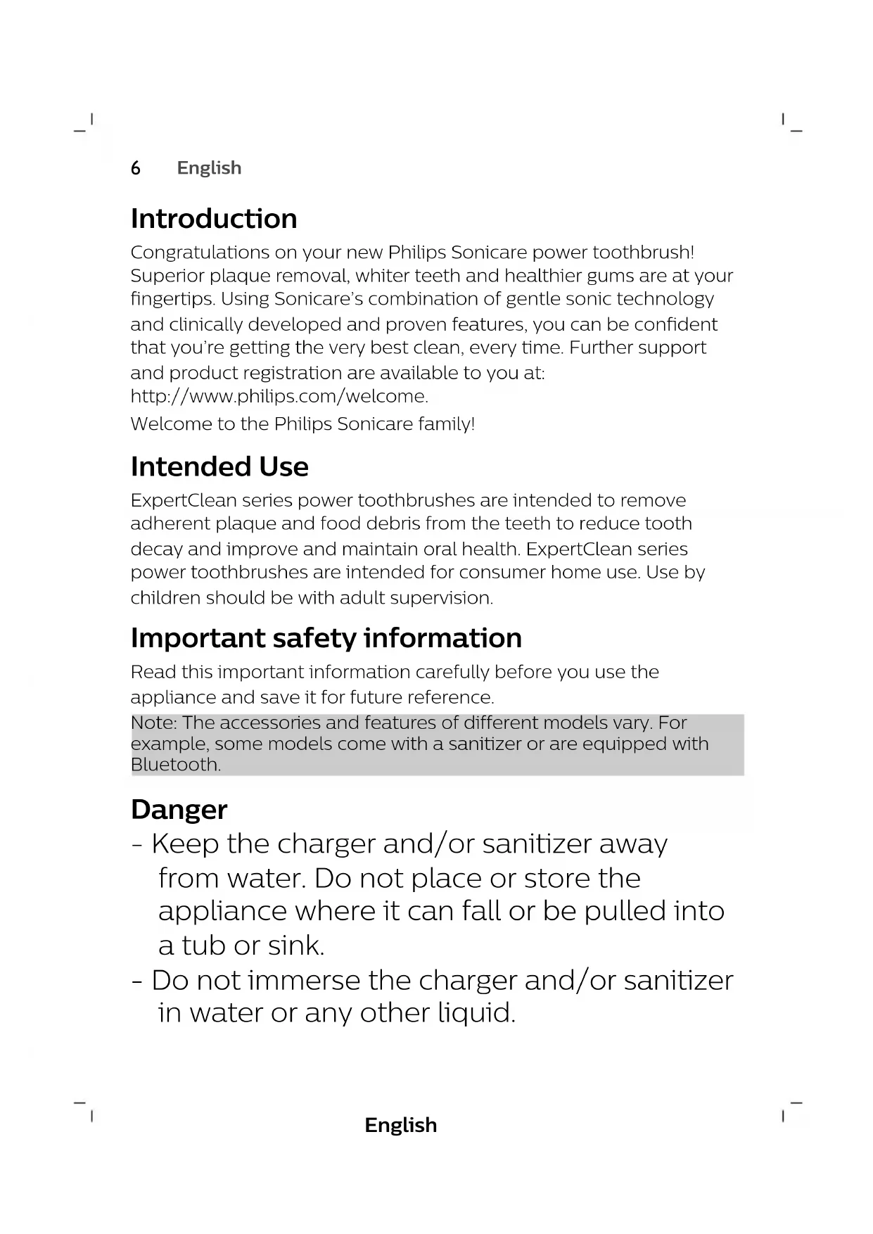 215English Introduction Congratulations on your new Philips Sonicare power toothbrush! Superior plaque removal, whiter teeth and healthier gums are at your fingertips. Using Sonicare’s combination of gentle sonic technology and clinically developed and proven features, you can be confident that you’re getting the very best clean, every time. Further support and product registration are available to you at: http://www.philips.com/welcome. Welcome to the Philips Sonicare family! Intended Use ExpertClean series power toothbrushes are intended to remove adherent plaque and food debris from the teeth to reduce tooth decay and improve and maintain oral health. ExpertClean series power toothbrushes are intended for consumer home use. Use by children should be with adult supervision. Important safety information Read this important information carefully before you use the appliance and save it for future reference. Note: The accessories and features of different models vary. For example, some models come with a sanitizer or are equipped with Bluetooth. Danger - Keep the charger and/or sanitizer away from water. Do not place or store the appliance where it can fall or be pulled into a tub or sink. - Do not immerse the charger and/or sanitizer in water or any other liquid.