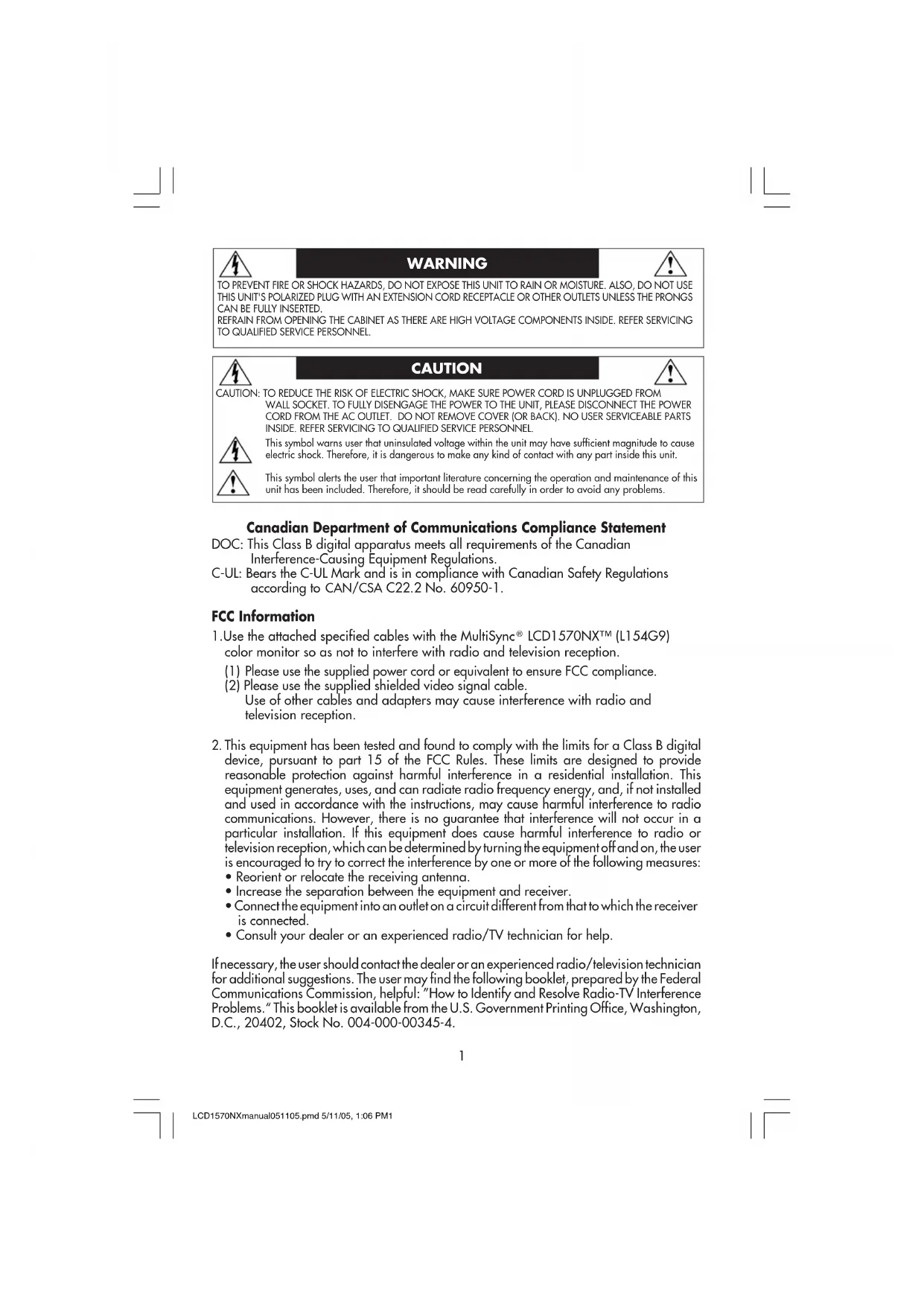 This device complies with Part 15 of FCC Rules. Operation is subject to the following two conditions. (1) This device may not cause harmful interference, and (2) this device must accept any interference received, including interference that may cause undesired operation. U.S. Responsible Party: NEC Display Solutions of America, Inc. Address: 500 Park Blvd, Suite 1100 Itasca, Illinois 60143 Tel. No.: (630) 467-3000 Type of Product: Display Monitor Equipment Classification: Class B Peripheral Model: MultiSync LCD1570NX (L154G9) We hereby declare that the equipment specified above conforms to the technical standards as specified in the FCC Rules. Windows is a registered trademark of Microsoft Corporation. NEC is a registered trademark of NEC Corporation. ENERGY STAR is a U.S. registered trademark. All other brands and product names are trademarks or registered trademarks of their respective owners. As an ENERGY STAR