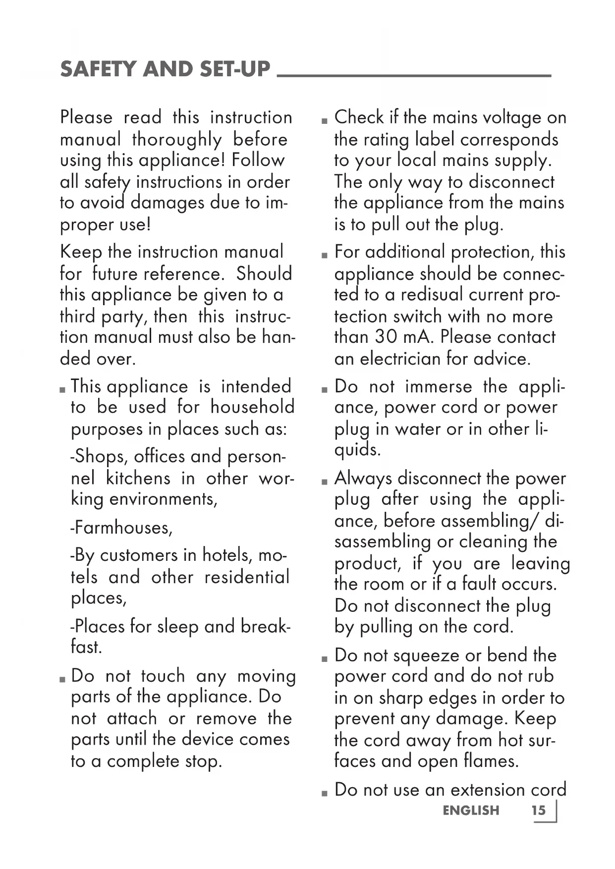 dangerous situations concerning the safety of life and property. Materials are intended to be in contact with food. Protection class for electric shock.19 ENGLISH Preparation 1 Remove all packaging and sticker ma- terials and dispose of them according to the applicable legal regulations. 2 Before using the appliance for the first time, clean all parts which come into contact with food (see the “Cleaning and Care” section). 3 Before using the appliance, cut the fruits into halves. OPERATION
