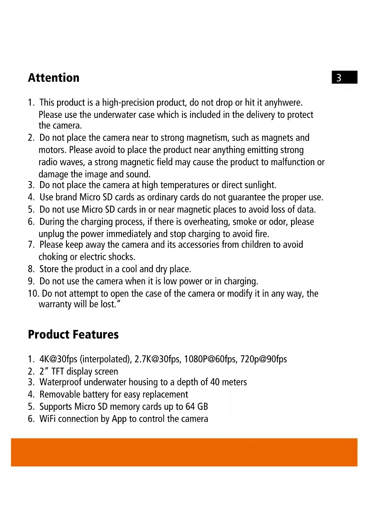 10. Do not attempt to open the case of the camera or modify it in any way, the