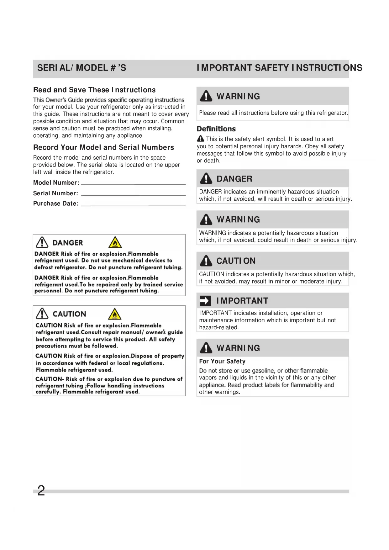 WARNING WARNING indicates a potentially hazardous situation which, if not avoided, could result in death or serious injury. IMPORTANT IMPORTANT indicates installation, operation or maintenance information which is important but not hazard-related. DANGER DANGER indicates an imminently hazardous situation which, if not avoided, will result in death or serious injury. This is the safety alert symbol. It is used to alert you to potential personal injury hazards. Obey all safety messages that follow this symbol to avoid possible injury or death. CAUTION CAUTION indicates a potentially hazardous situation which, if not avoided, may result in minor or moderate injury. WARNING Please read all instructions before using this refrigerator. Read and Save These Instructions for your model. Use your refrigerator only as instructed in this guide. These instructions are not meant to cover every possible condition and situation that may occur. Common sense and caution must be practiced when installing, operating, and maintaining any appliance. Record Your Model and Serial Numbers Record the model and serial numbers in the space provided below. The serial plate is located on the upper left wall inside the refrigerator. Model Number: Serial Number: Purchase Date: WARNING For Your Safety vapors and liquids in the vicinity of this or any other other warnings.
