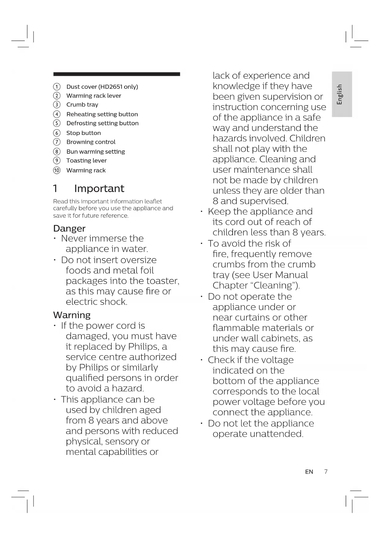 - Do not let the appliance operate unattended.• Do not place the dust cover (HD2651 only) or any other object on top of the toaster when the appliance is switched on or when it is still hot, as this can cause damage or re.