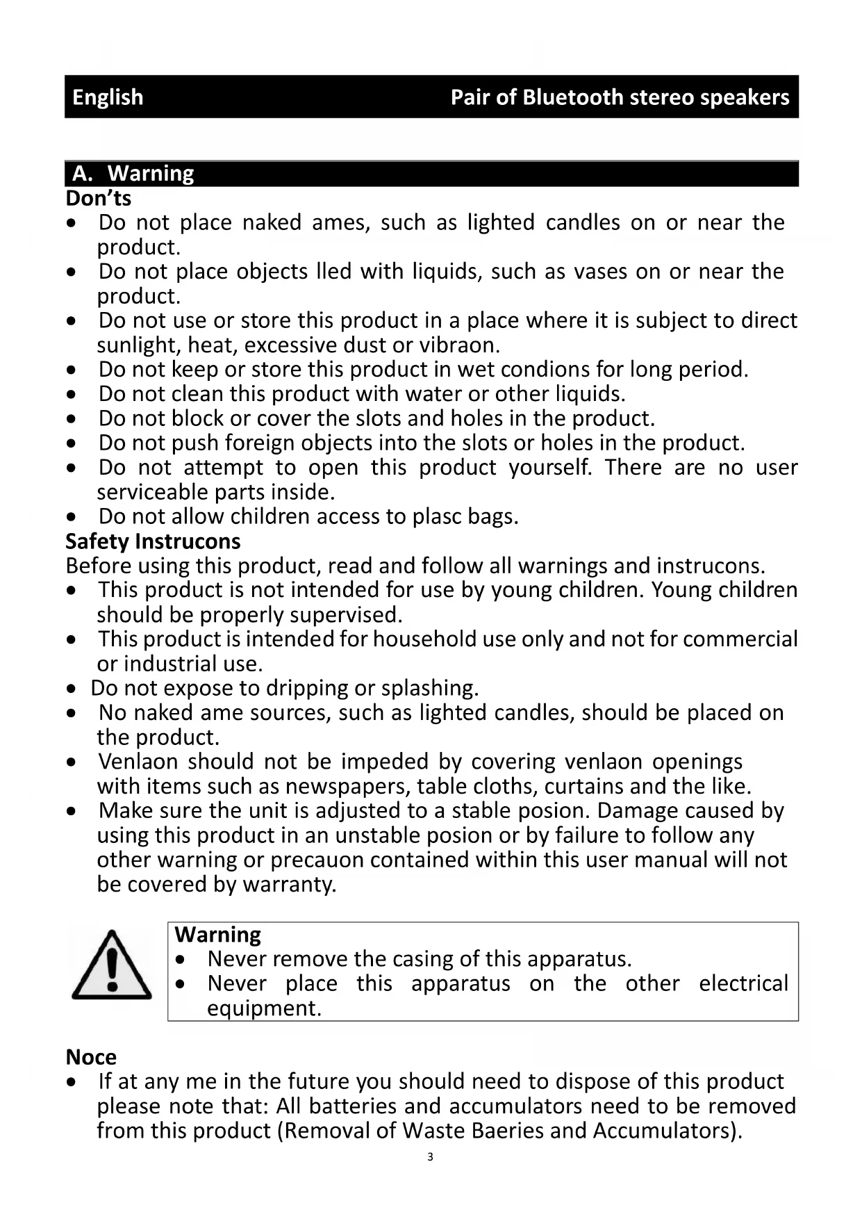 same time, the device is reset and turn to OFF, and then press and hold “ (2)” button to turn On and restart the device after reset is done. O. Trouble Shooting No power Check battery is it charged with enough energy. Check whether the device is in power OFF mode. No sound Check whether volume level is in lower position on your speaker and mobile phone or PC/Mac. Make sure that your Bluetooth device is within the effective operation range. Check whether the Bluetooth device is paired. Check whether the Bluetooth device show connected. Check if you have selected the correct audio source. No response from speaker Restart the speaker by reset function.