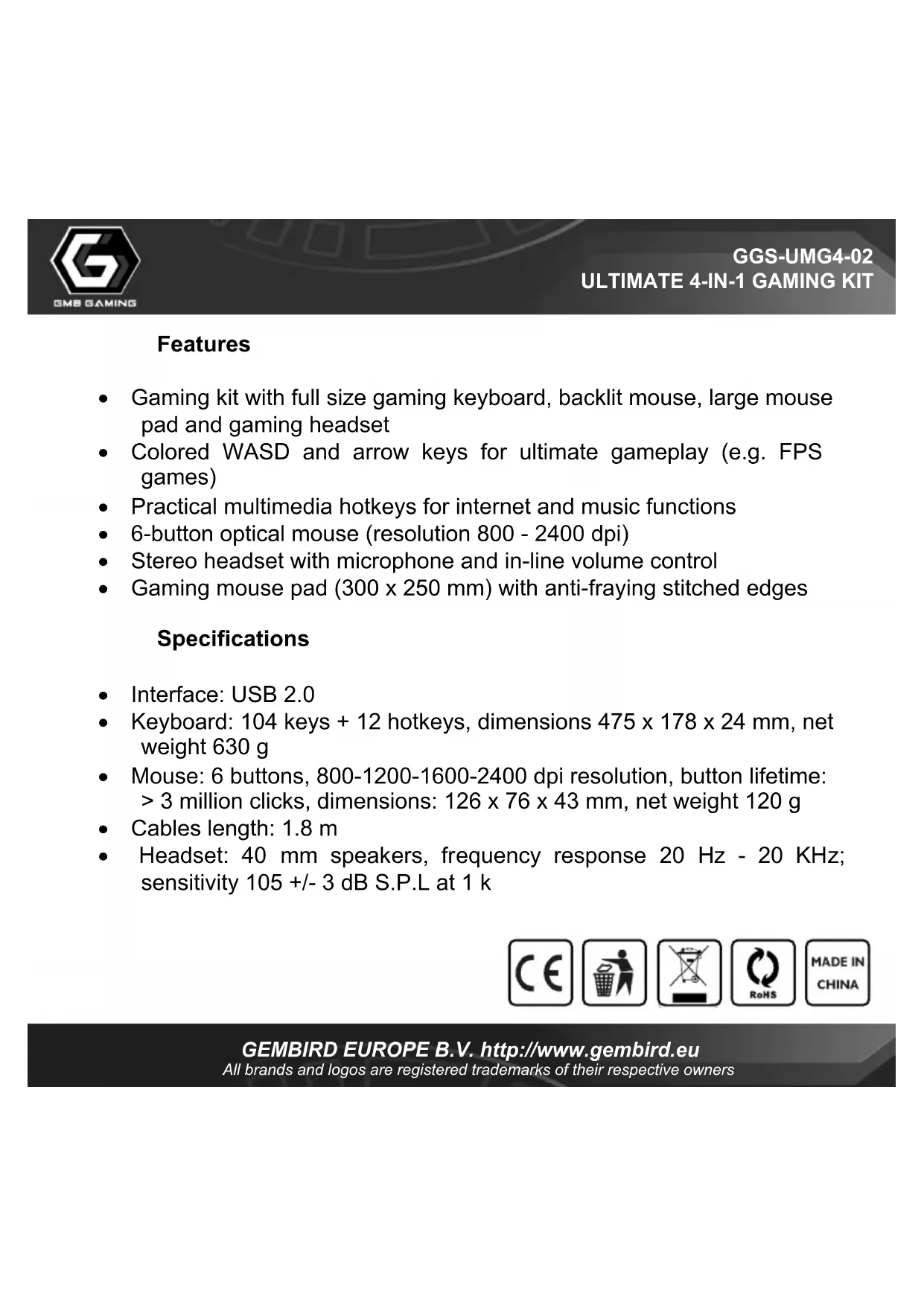 Features Gaming kit with full size gaming keyboard, backlit mouse, large mouse pad and gaming headset Colored WASD and arrow keys for ultimate gameplay (e.g. FPS games) Practical multimedia hotkeys for internet and music functions 6-button optical mouse (resolution 800 - 2400 dpi) Stereo headset with microphone and in-line volume control Gaming mouse pad (300 x 250 mm) with anti-fraying stitched edges Specifications Interface: USB 2.0 Keyboard: 104 keys + 12 hotkeys, dimensions 475 x 178 x 24 mm, net weight 630 g Mouse: 6 buttons, 800-1200-1600-2400 dpi resolution, button lifetime: > 3 million clicks, dimensions: 126 x 76 x 43 mm, net weight 120 g Cables length: 1.8 m Headset: 40 mm speakers, frequency response 20 Hz - 20 KHz; sensitivity 105 +/- 3 dB S.P.L at 1 k3 GEMBIRD EUROPE B.V. http://www.gembird.eu All brands and logos are registered trademarks of their respective owners GGS-UMG4-02