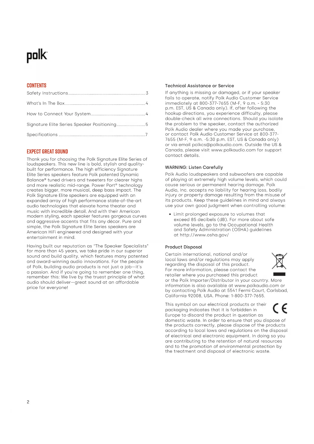 - Limit prolonged exposure to volumes that exceed 85 decibels (dB). For more about safe volume levels, go to the Occupational Health and Safety Administration (OSHA) guidelines at http://www.osha.gov/ Product Disposal Certain international, national and/or local laws and/or regulations may apply regarding the disposal of this product. For more information, please contact the retailer where you purchased this product or the Polk Importer/Distributor in your country. More information is also available at www.polkaudio.com or by contacting Polk Audio at 5541 Fermi Court, Carlsbad, California 92008, USA. Phone: 1-800-377-7655. This symbol on our electrical products or their packaging indicates that it is forbidden in Europe to discard the product in question as domestic waste. In order to ensure that you dispose of the products correctly, please dispose of the products according to local laws and regulations on the disposal of electrical and electronic equipment. In doing so you are contributing to the retention of natural resources and to the promotion of environmental protection by the treatment and disposal of electronic waste. Contents Safety Instructions ................................................................. 3 What’s In The Box ....................................................................4 How to Connect Your System ..............................................4 Signature Elite Series Speaker Positioning ........................ 5 Specifications .........................................................................7 Expect Great Sound Thank you for choosing the Polk Signature Elite Series of loudspeakers. This new line is bold, stylish and quality- built for performance. The high efficiency Signature Elite Series speakers feature Polk patented Dynamic Balance® tuned drivers and tweeters for clearer highs and more realistic mid-range. Power Port® technology creates bigger, more musical, deep bass impact. The Polk Signature Elite speakers are equipped with an expanded array of high performance state-of-the-art audio technologies that elevate home theater and music with incredible detail. And with their American modern styling, each speaker features gorgeous curves and aggressive accents that fits any décor. Pure and simple, the Polk Signature Elite Series speakers are American HiFi engineered and designed with your entertainment in mind. Having built our reputation as “The Speaker Specialists” for more than 45 years, we take pride in our superior sound and build quality, which features many patented and award-winning audio innovations. For the people of Polk, building audio products is not just a job—it’s a passion. And if you’re going to remember one thing, remember this: We live by the truest principle of what audio should deliver—great sound at an affordable price for everyone!Signature Elite Series