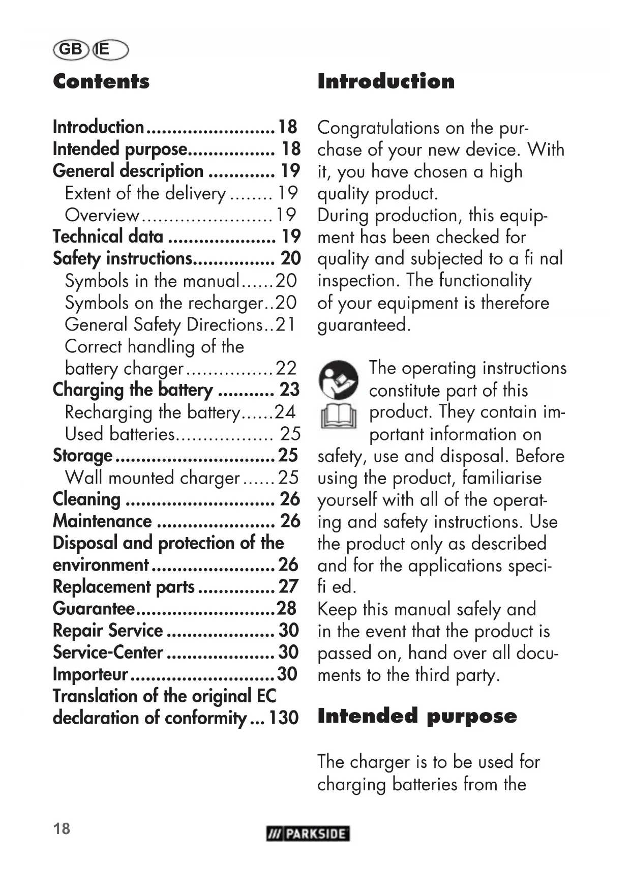 - Importeur GB IE Parkside X12V Team series only. Any other use that is not explicitly approved in these in- structions may result in damage to the equipment and represent a serious danger to the user. This equipment is not suitable for commercial use. Commer- cial use will invalidate the guarantee. The manufacturer is not liable for damages caused by an improper use or incorrect oper- ation of this device. General description The illustrations are on the front fold-out page. Extent of the delivery - Charger - Instruction Manual The battery is not included in delivery. Dispose of the packaging mate- rial correctly. Overview 1 Rechargeable battery 2 Battery release button 3 Charger 4 Red LED 5 Green LED Technical data Charger p. 3019