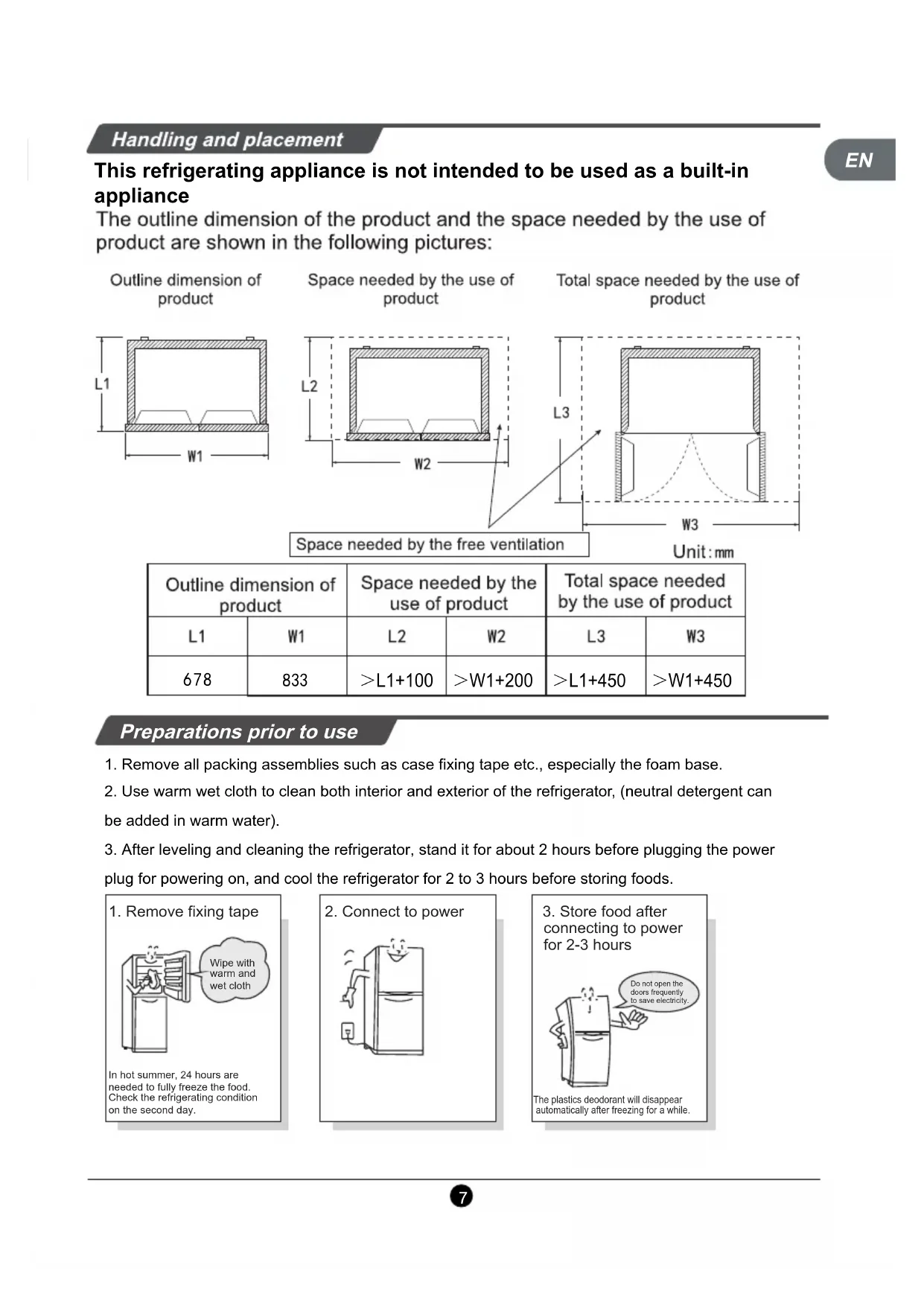 connecting to power for 2-3 hoursWipe with warm and wet clothIn hot summer, 24 hours are needed to fully freeze the food. Check the refrigerating condition on the second day.Do not open the doors frequently to save electricity.The plastics deodorant will disappear automatically after freezing for a while.EN The appliance should be located in the coolest area of the room, away from heat producing appliances or heating ducts, and out of the direct sunlight.Let hot foods cool to room temperature before placing in the appliance. Overloading the appliance forces the compressor to run longer. Foods that freeze too slowly may lose quality, or spoil.Be sure to wrap foods properly, and wipe containers dry before placing them in the appliance. This cuts down on frost build-up inside the appliance.Appliance storage bin should not be lined with aluminum foil, wax paper, or paper toweling. Liners interfere with cold air circulation, making the appliance less efficient.Organize and label food to reduce door openings and extended searches. Remove as many items as needed at one time, and close the door as soon as possible.Please refer to the product introduction picture on page 5 for the placement of accessories.