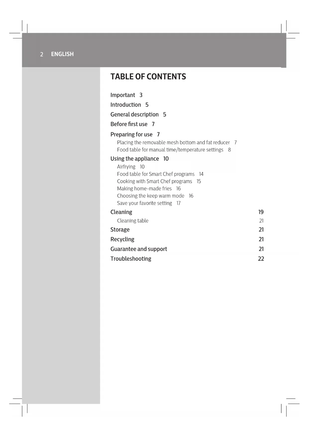 Important 3 Introduction 5 General description 5 Before rst use 7 Preparing for use 7 Placing the removable mesh bottom and fat reducer 7 Food table for manual time/temperature settings 8 Using the appliance 10 Airfrying 10 Food table for Smart Chef programs 14 Cooking with Smart Chef programs 15 Making home-made fries 16 Choosing the keep warm mode 16 Save your favorite setting 17 Cleaning 19 Cleaning table 21 Storage 21 Recycling 21 Guarantee and support 21 Troubleshooting 223 ENGLISH Important Read this important information carefully before you use the appliance and save it for future reference. Danger - Never immerse the appliance in water nor rinse it under the tap. - Do not let any water or other liquid enter the appliance to prevent electric shock. - Always put the ingredients to be fried in the basket, to prevent them from coming into contact with the heating elements. - Do not cover the air inlet and the air outlet openings while the appliance is operating. - Do not ll the pan with oil as this may cause a re hazard. - Do not use the appliance, if the plug, the mains cord or the appliance itself is damaged. - Never touch the inside of the appliance while it is operating. - Never put any amount of food that exceeds the maximum level indicated in the basket. - Always make sure heater is free and no food stuck in heater. Warning - If the supply cord is damaged, it must be replaced by Philips, its service agent or similarly qualied persons in order to avoid a hazard. - Only connect the appliance to an earthed wall socket. Always make sure that the plug is inserted into the wall socket properly. - This appliance is not intended to be operated by means of an external timer or a separate remote-control system. - The accessible surfaces may become hot during use. - This appliance can be used by children aged from 8 years and above and persons with reduced physical, sensory or mental capabilities or lack of experience and knowledge if they have been given supervision or instruction concerning use of the appliance in a safe way and understand the hazards involved. Children shall not play with the appliance. Cleaning and user maintenance shall not be made by children unless they are older than 8 and supervised. - Keep the appliance and its cord out of the reach of children less than 8 years. - Do not place the appliance against a wall or against other appliances. Leave at least 10 cm free space at the back, on both sides and above the appliance. Do not place anything on top of the appliance. - During hot air frying, hot steam is released through the air outlet openings. Keep your hands and face at a safe distance from the steam and from the air outlet openings. Also, be careful of hot steam and air when you remove the pan from the appliance. - Never use light ingredients or packing paper in the appliance. - Accessible surfaces may become hot during use.4 ENGLISH - Storage of potatoes: The temperature shall be appropriate to the potato variety stored and it shall be above 6°C to minimize the risk of acrylamide exposure in the prepared foodstu. - Do not place the appliance on or near a hot gas stove or all kinds of electric stove and electric cooking plates, or in a heated oven. - Never ll the pan with oil. - This appliance is designed to be used at ambient temperatures between 5°C and 40°C. - Check if the voltage indicated on the appliance corresponds to the local mains voltage before you connect the appliance. - Keep the mains cord away from hot surfaces. - Do not place the appliance on or near combustible materials such as a tablecloth or curtain. - Do not use the appliance for any other purpose than described in this manual and use only original Philips-accessories. - Do not let the appliance operate unattended. - The pan, basket and fat reducer becomes hot during and after use of the appliance, always handle carefully. - Thoroughly clean the parts that come into contact with food before you use the appliance for the rst time. Refer to the instructions in the manual. Caution - This appliance is intended for normal household use only. It is not intended for use in environments such as sta kitchens of shops, oces, farms or other work environments. Nor is it intended to be used by clients in hotels, motels, bed and breakfasts and other residential environments. - Always disconnect the appliance from the supply if it is left unattended and before you assemble, disassemble, store or cleaning. - Place the appliance on a horizontal, even and stable surface. - If the appliance is used improperly or for professional or semi- professional purposes or if it is not used according to the instructions in the user manual, the guarantee becomes invalid and Philips refuses any liability for damage caused. - Always return the appliance to a service center authorised by Philips for examination or repair. Do not attempt to repair the appliance yourself, otherwise the guarantee becomes invalid. - Always unplug the appliance after use. - Let the appliance cool down for approximately 30 minutes before you handle or clean it. - Make sure the ingredients prepared in this appliance come out golden yellow instead of dark or brown. Remove burnt remnants. Do not fry fresh potatoes at a temperature above 180°C (to minimise the production of acrylamide). Electromagnetic elds (EMF) This Philips appliance complies with all applicable standards and regulations regarding electromagnetic elds.5 ENGLISH Automatic shut-o This appliance is equipped with an automatic shut-o function. When the time of the timer has elapsed, the device will shut o automatically. If you do not press a button within 30 minutes, the appliance switches o automatically. To switch o the appliance manually, press the power On/o button. Introduction Congratulations on your purchase and welcome to Philips! To fully benet from the support that Philips oers, register your product at www.philips.com/welcome. With Philips Airfryer, you can now enjoy perf