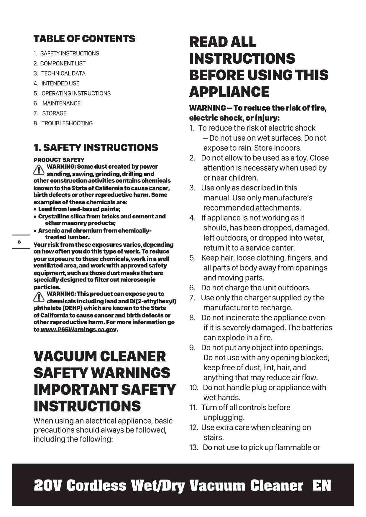 chemicals including lead and Di(2-ethylhexyl) phthalate (DEHP) which are known to the State of California to cause cancer and birth defects or other reproductive harm. For more information go to www.P65Warnings.ca.gov. VACUUM CLEANER SAFETY WARNINGS IMPORTANT SAFETY INSTRUCTIONS When using an electrical appliance, basic precautions should always be followed, including the following: READ ALL INSTRUCTIONS