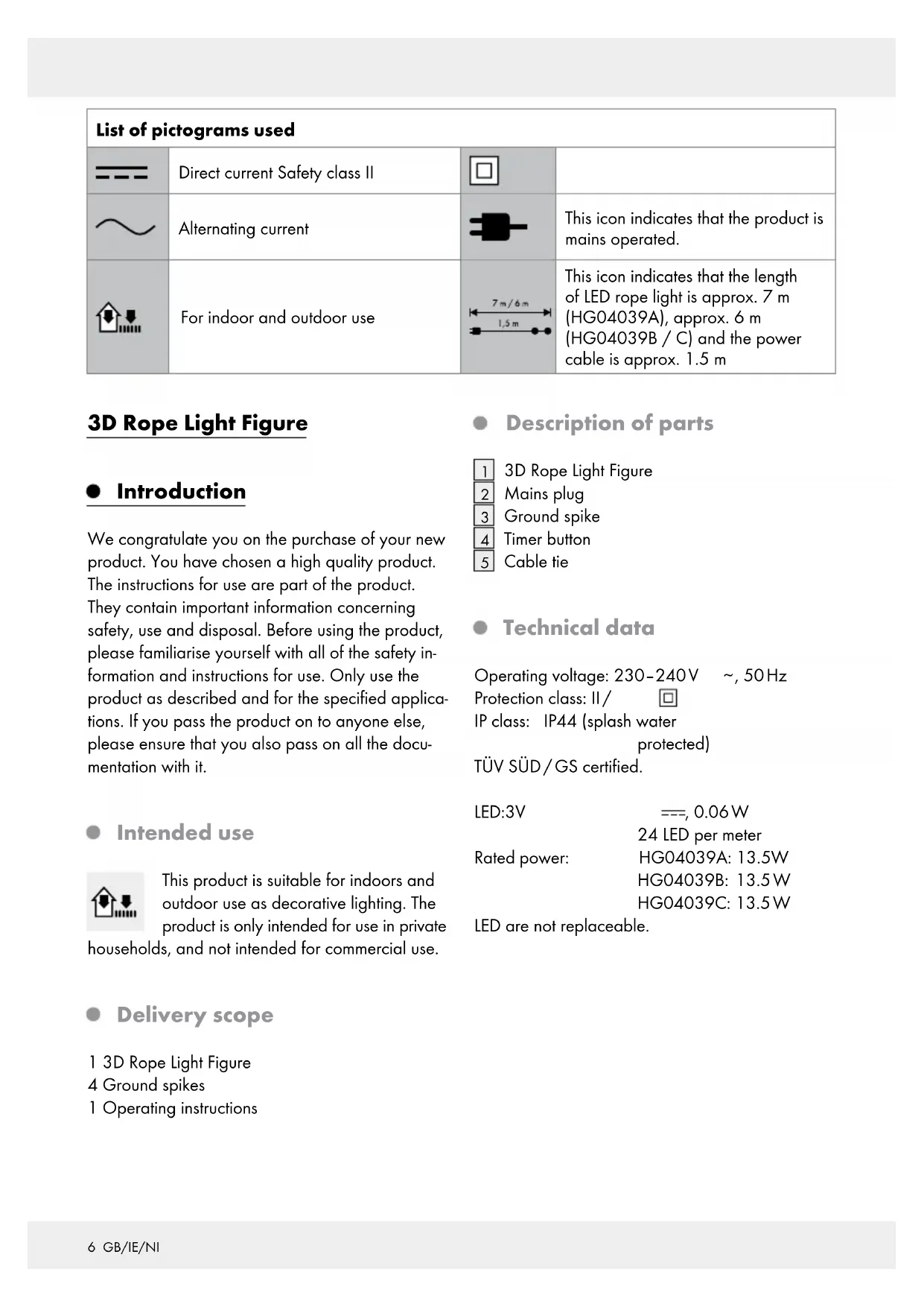 containers. Avoid locations where flooding occurs after heavy rain. Use the product outdoors only when connected to a mains soc ket protected by a residual- current product (RCD) with a rated trip current of not more than 30 mA. Please note that the plug / power adapter continues to draw a small amount of power even if the product is turned off as long as the plug / power adapter is plugged into a power outlet. To switch the product off completely, unplug the plug / power adapter from the socket. Do not recessed into a surface. Outdoor mains sockets must be suitable for use outdoors and should be at least 2.5 m from the nearest water container or body of water. The product is protected against splash water (IP44). This protec- tion standard is only possible if the mains socket also fulfills re- quirements of at least the same protection class. Ensure that the product is not laid out through areas in which lawn mowers, strimmers, shears or similar cutting tools are used. Ensure that the product does not present a trip hazard. If you have any questions about the product or are unsure about any of its aspects, please seek the advice of an electrical equip- ment specialist.9 GB/IE/NI Before use Note: Remove all packaging materials from the product. Installation Place the 3D rope light figure