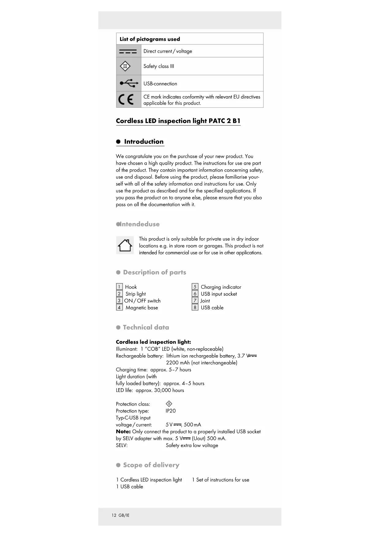 USB cable Technical data Cordless led inspection light: Illuminant: 1 “COB“ LED (white, non-replaceable) Rechargeable battery: lithium ion rechargeable battery, 3.7 V 2200 mAh (not interchangeable) Charging time: approx. 5–7 hours Light duration (with fully loaded battery): approx. 4–5 hours LED life: approx. 30,000 hours Protection class: Protection type: IP20 Typ-C-USB input voltage / current: 5 V , 500 mA Note: Only connect the product to a properly installed USB socket by SELV adapter with max. 5 V (Uout) 500 mA. SELV: Safety extra low voltage Scope of delivery 1 Cordless LED inspection light 1 USB cable 1 Set of instructions for use13 GB/IE Safety instructions Before using the product, please familiarise yourself with all of the safety information and instructions for use! When passing this product on to others, please also include all the documents!